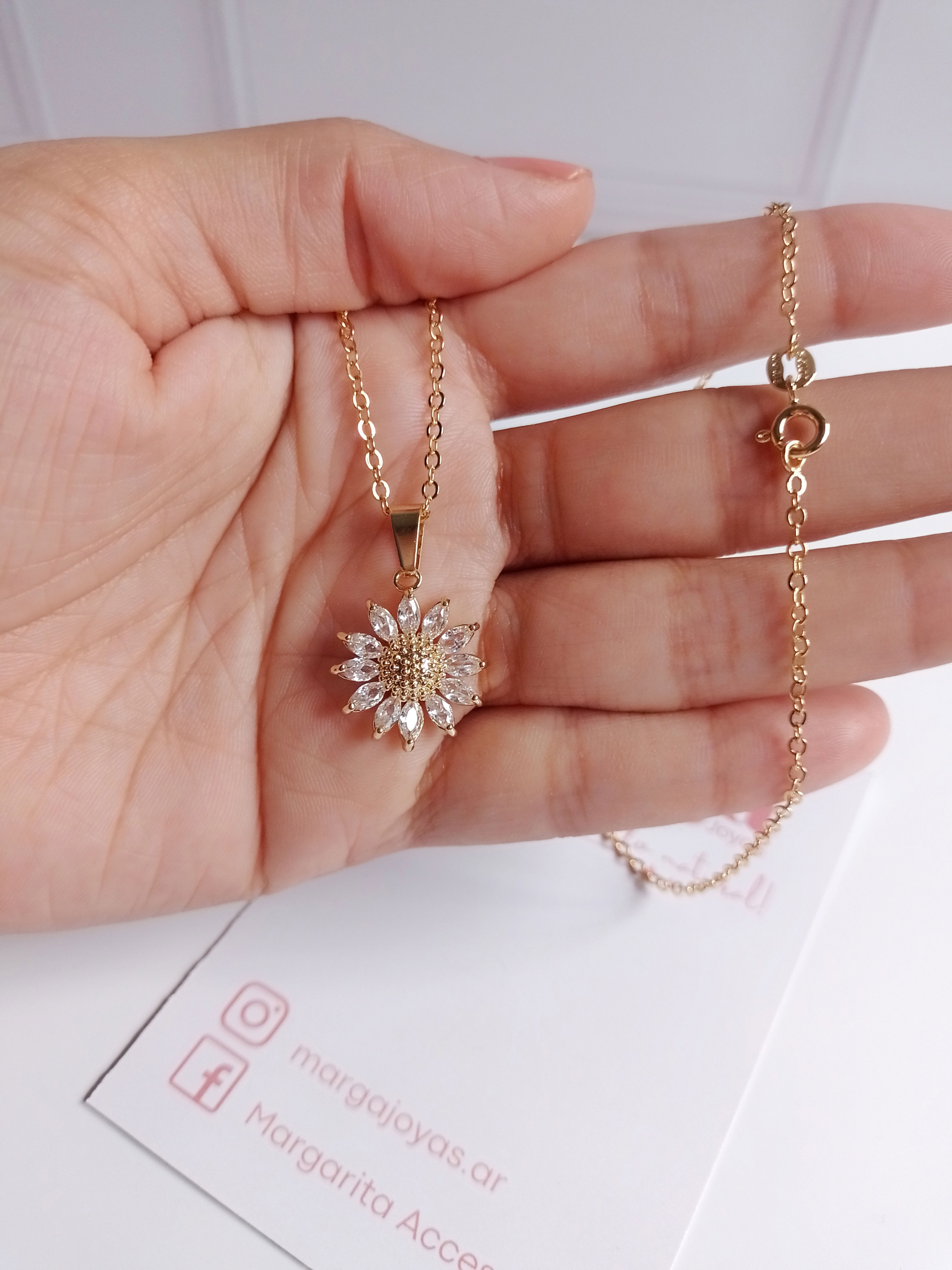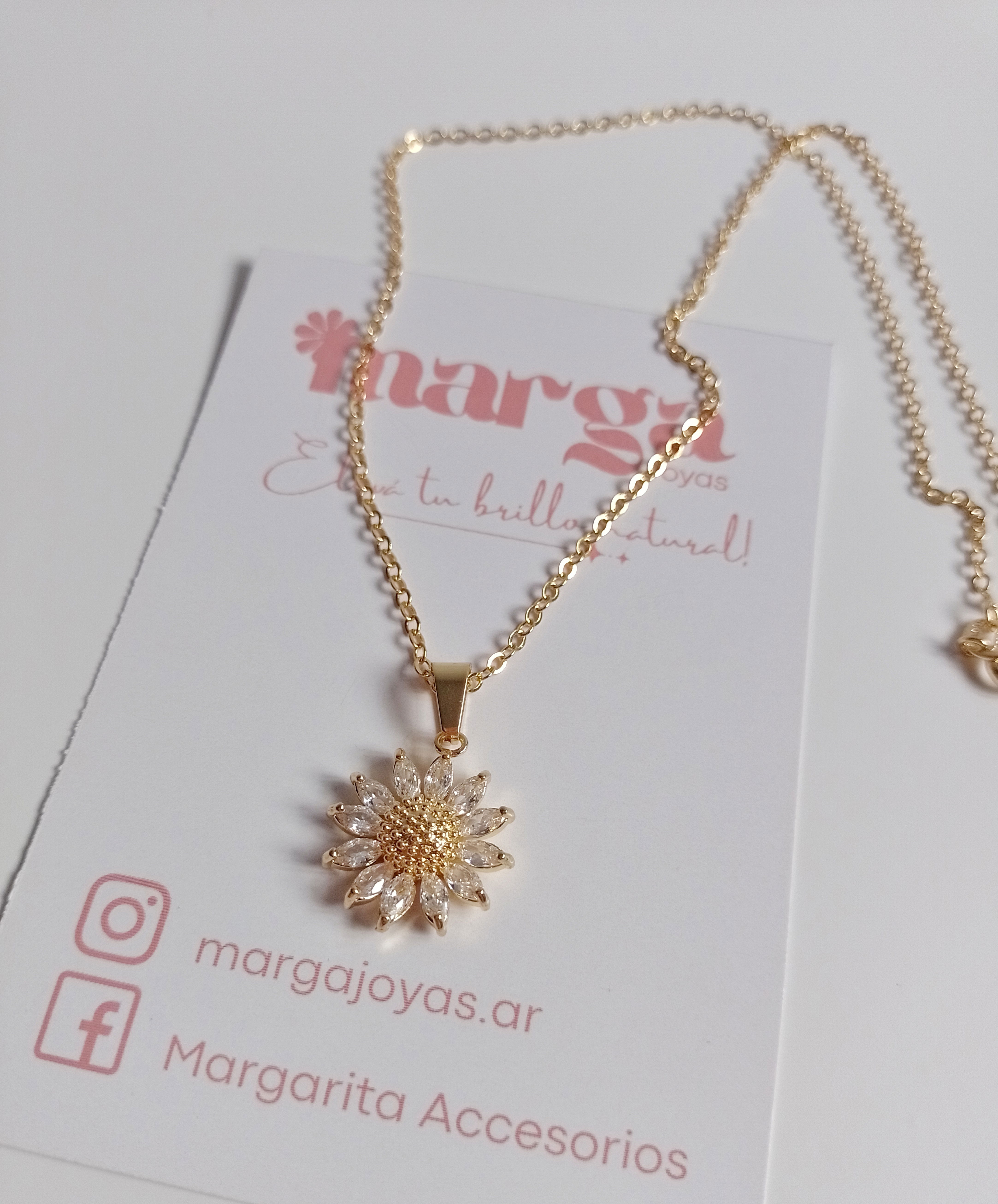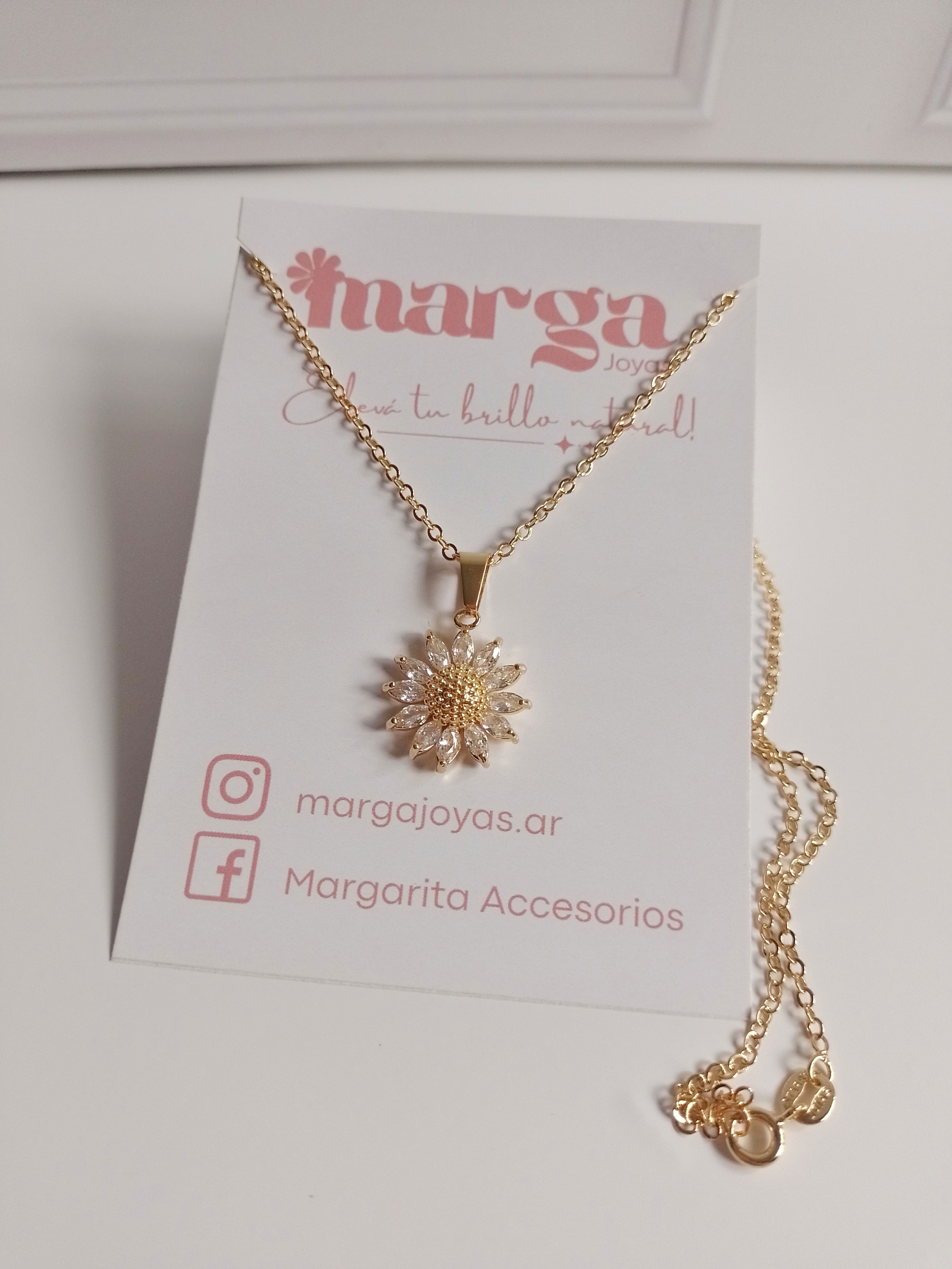 •Collar con dije en forma de Margarita, con zirconias color cristal en los pétalos. Dije laminado en Oro 18k