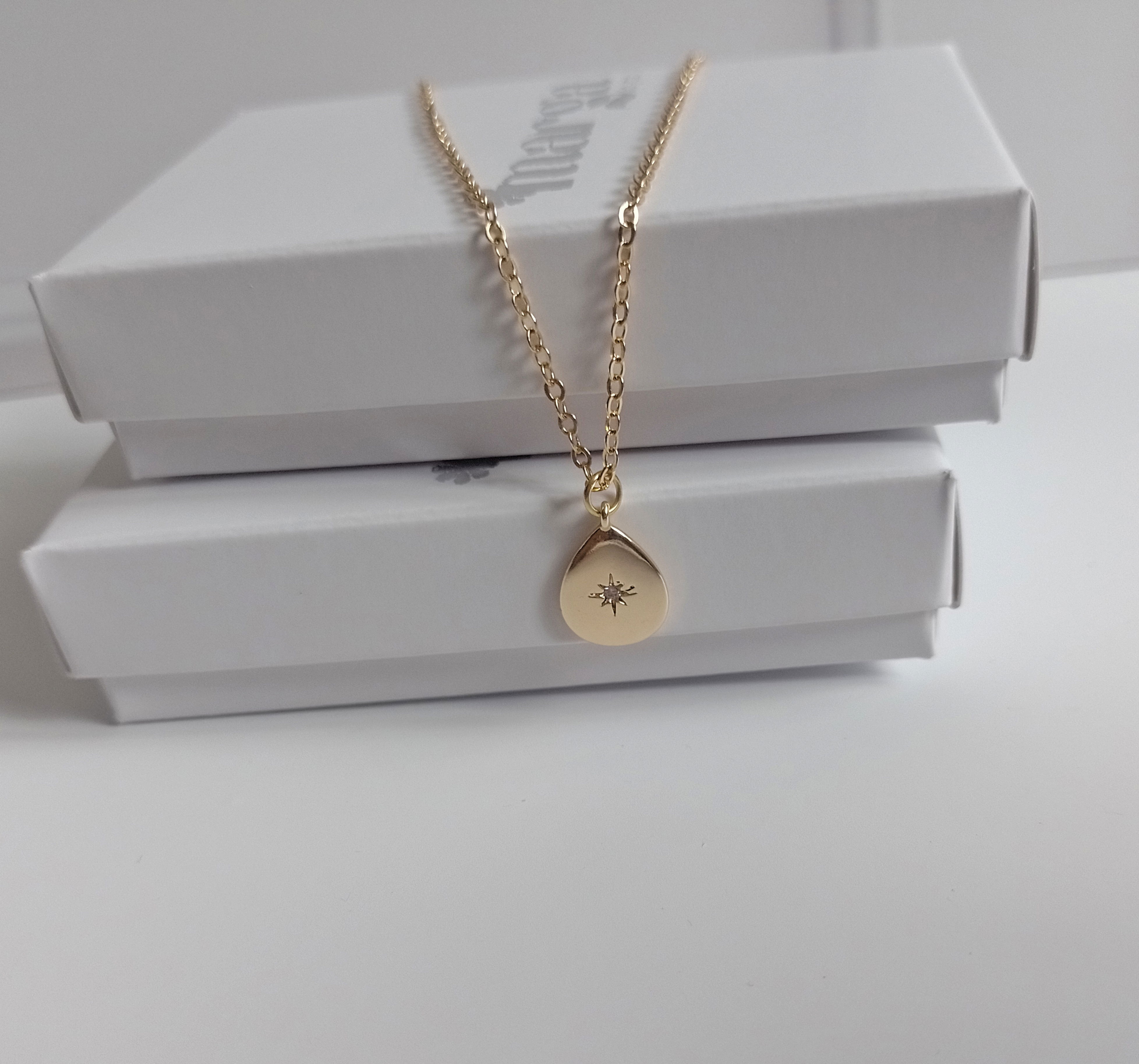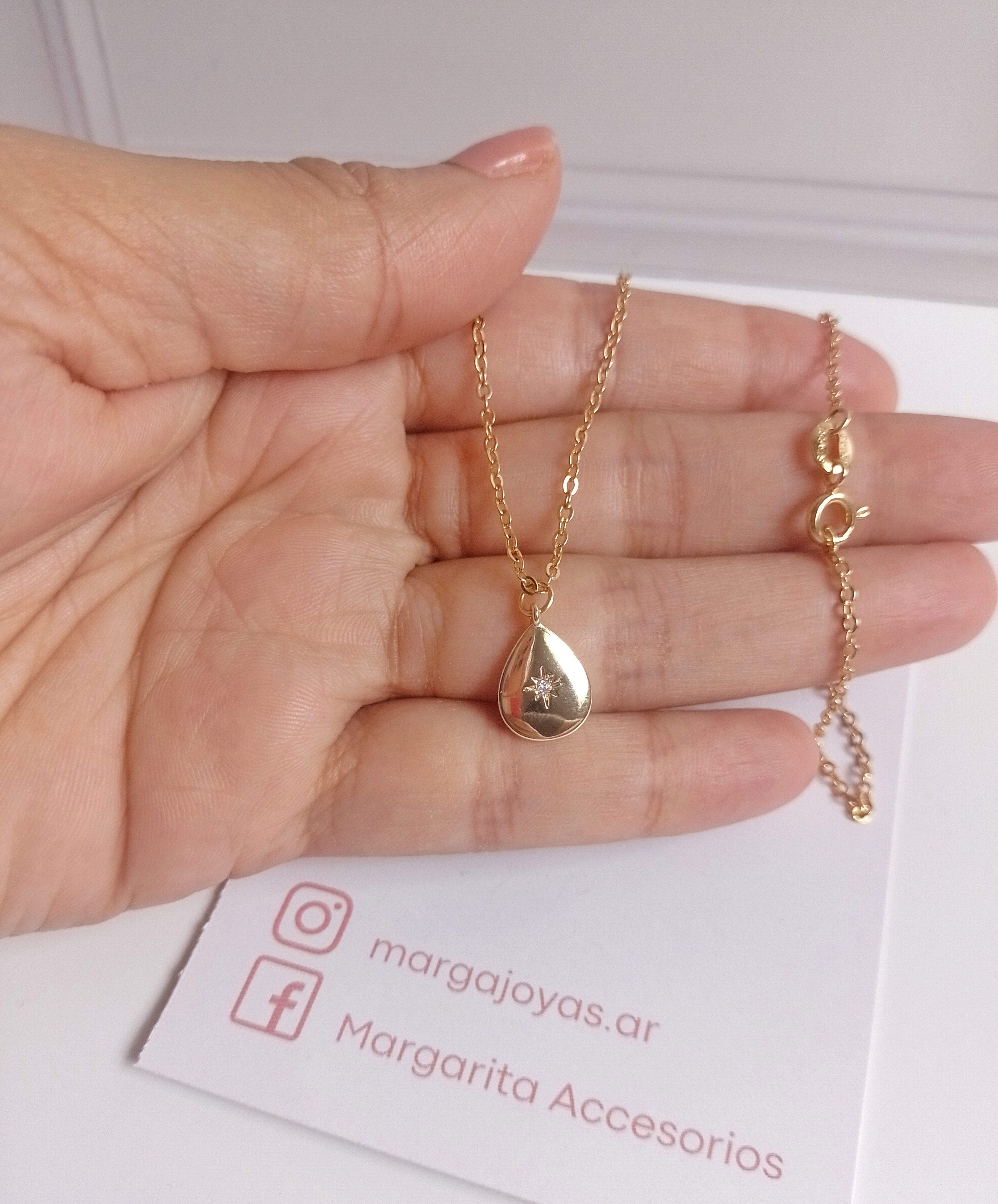 •Collar con dije en forma de gota plana con zirconia cristal en el medio