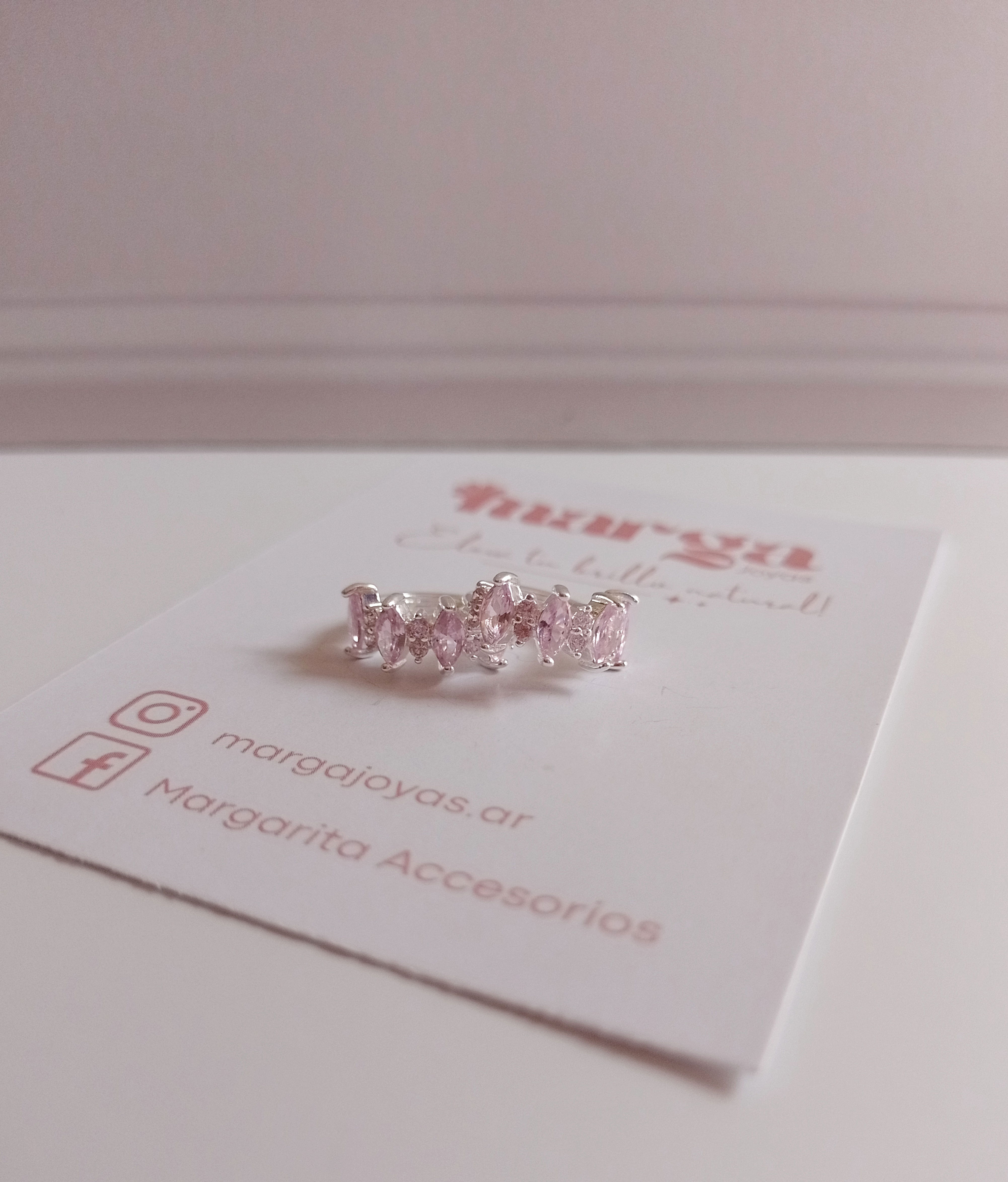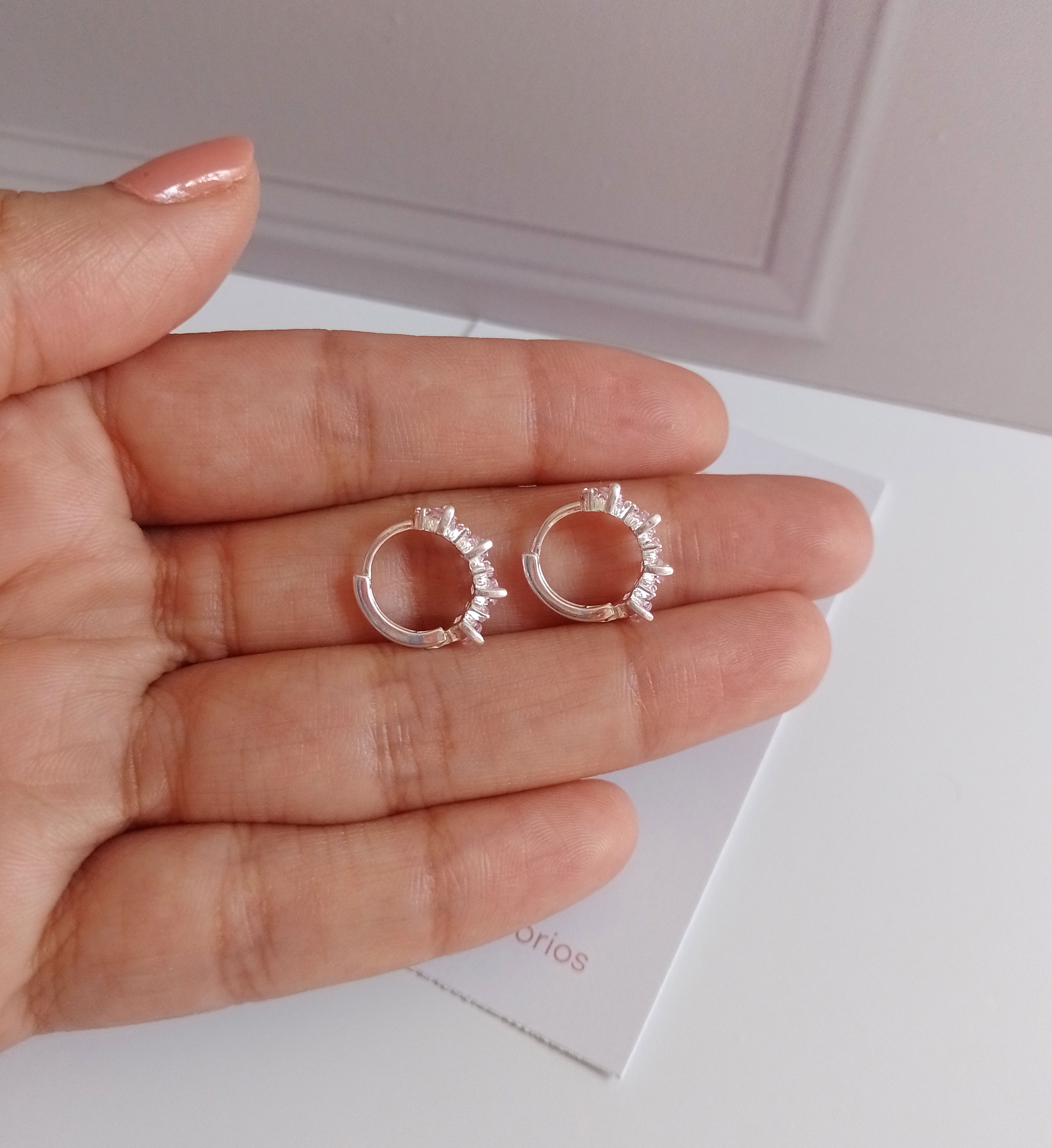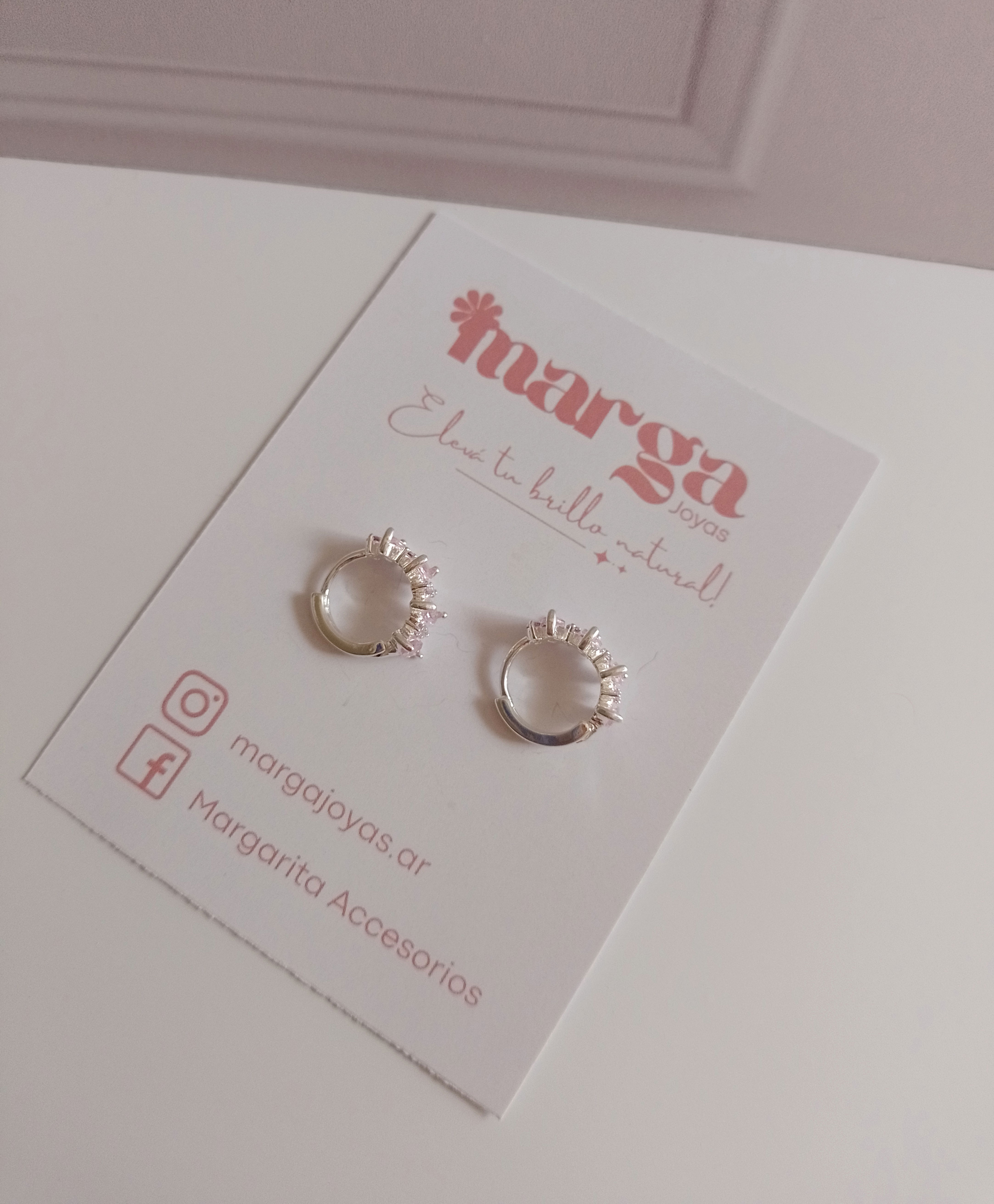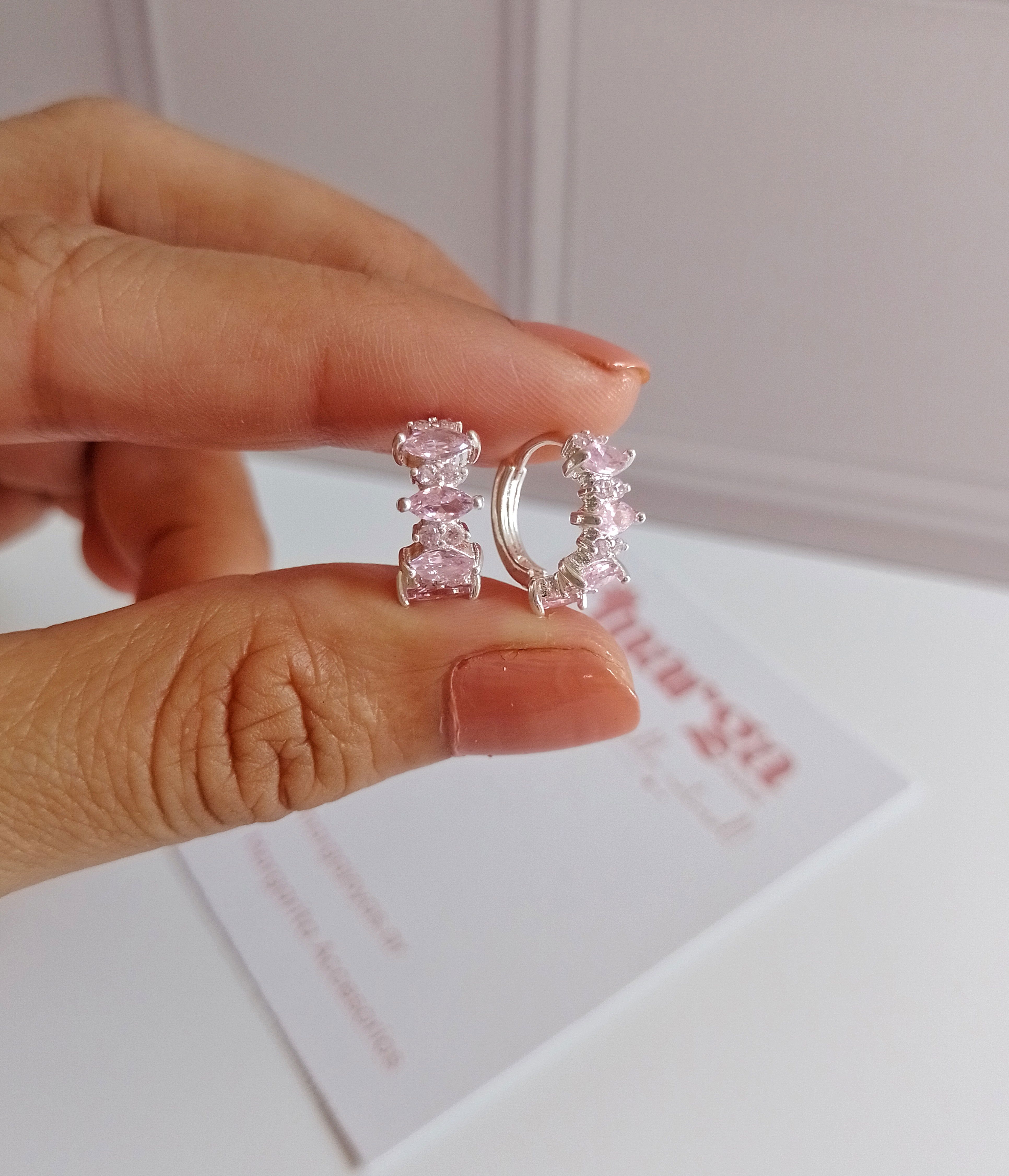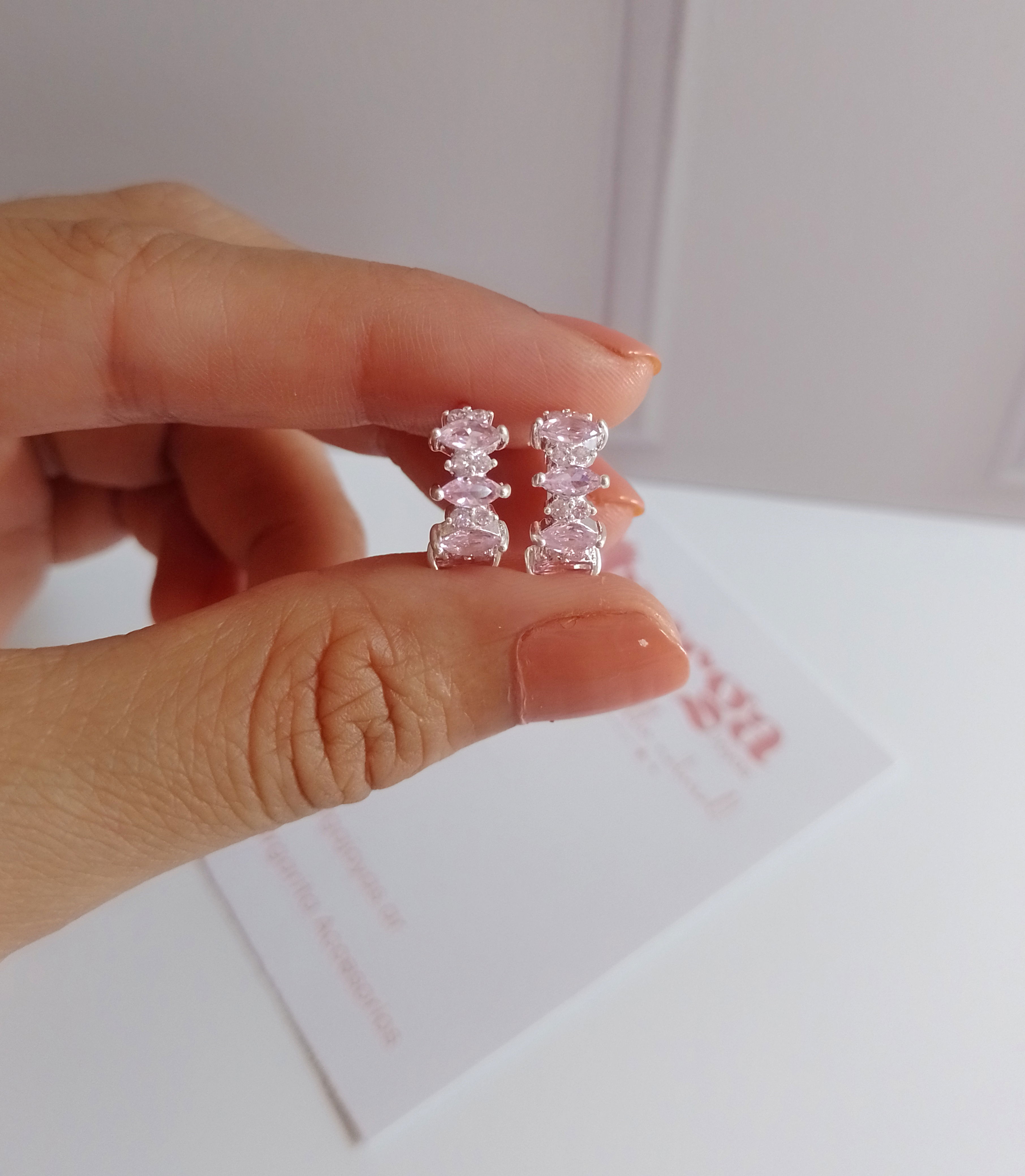 •Argollas de tamaño pequeño laminadas en plata con zirconias de color rosa claro.