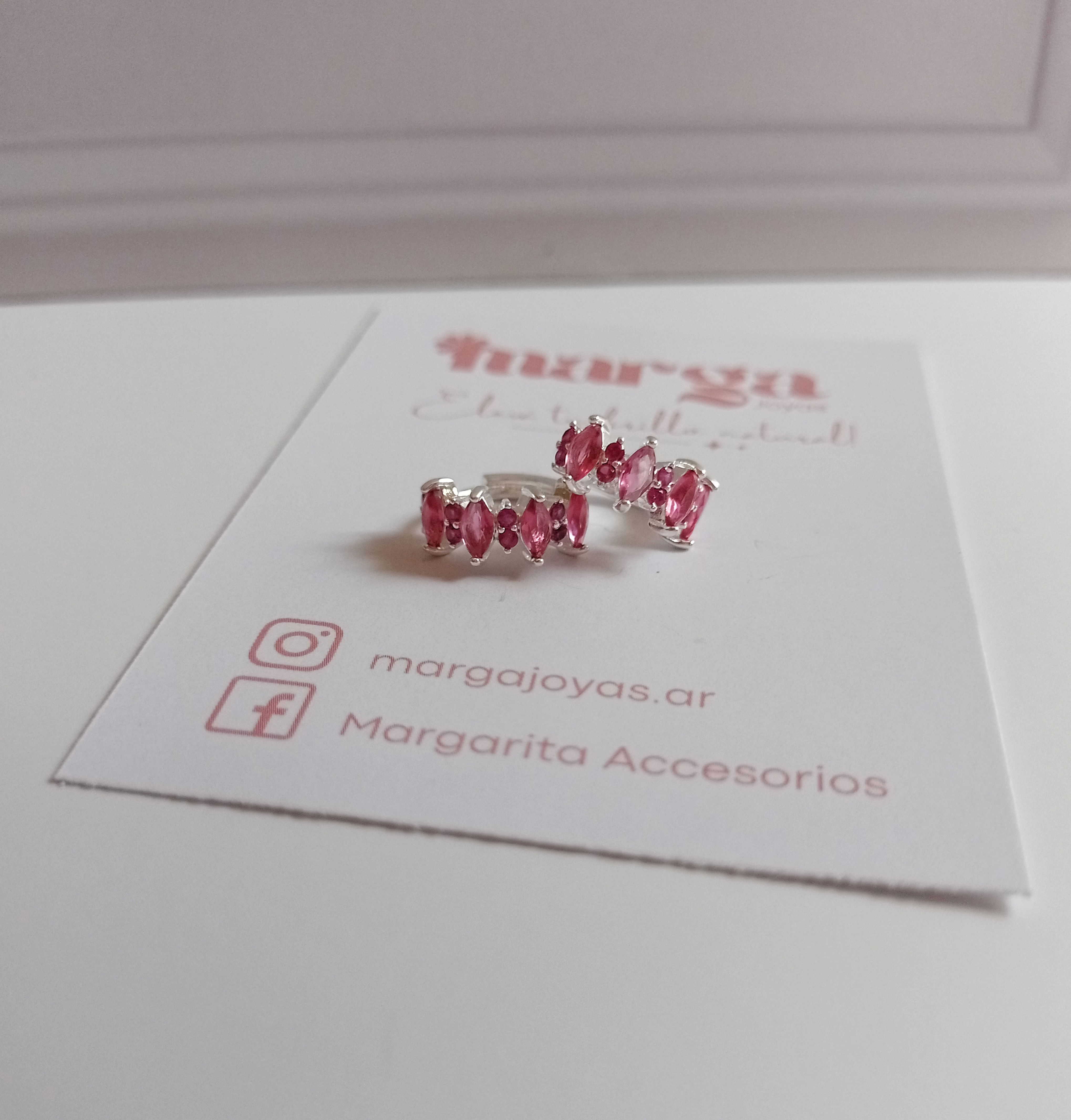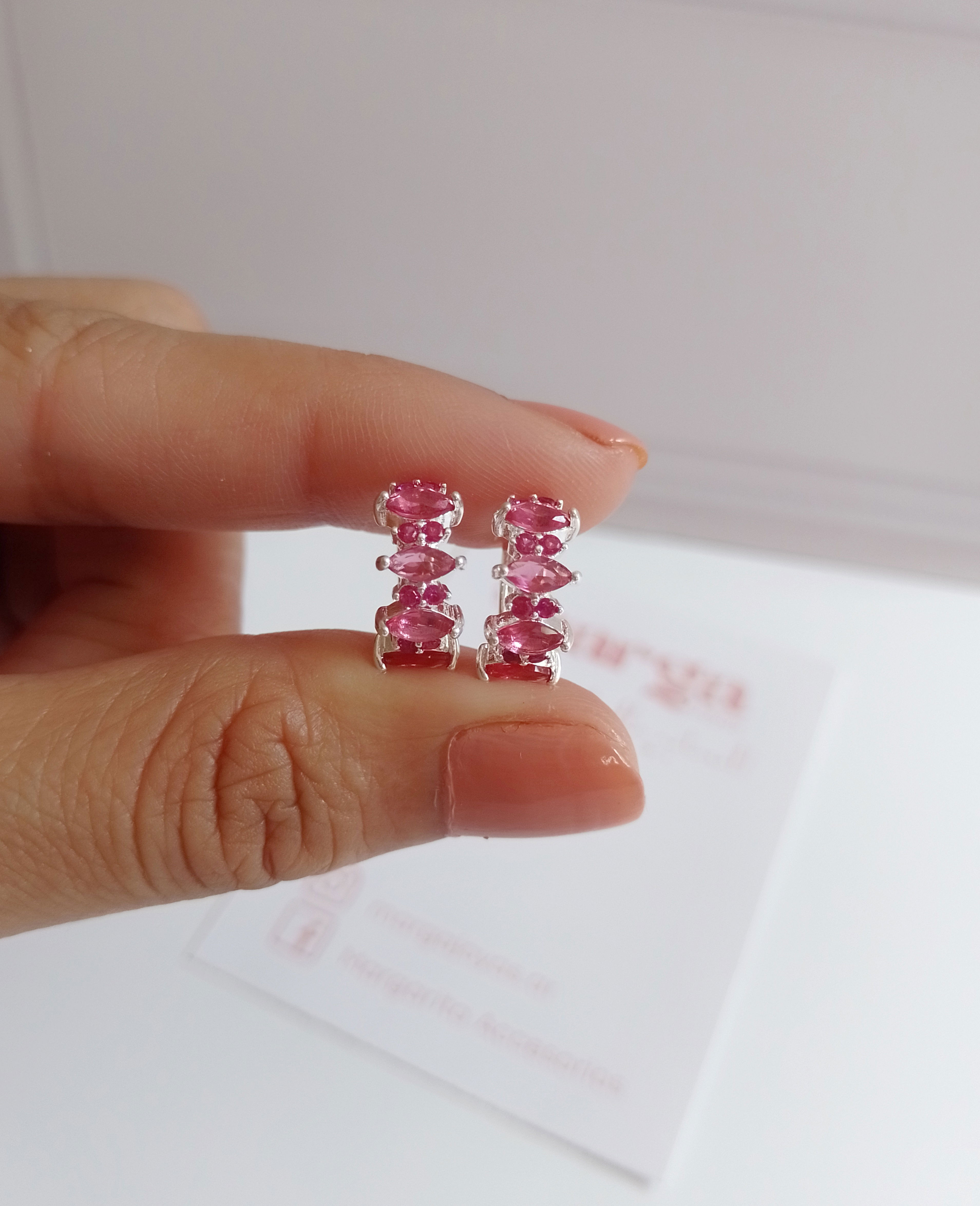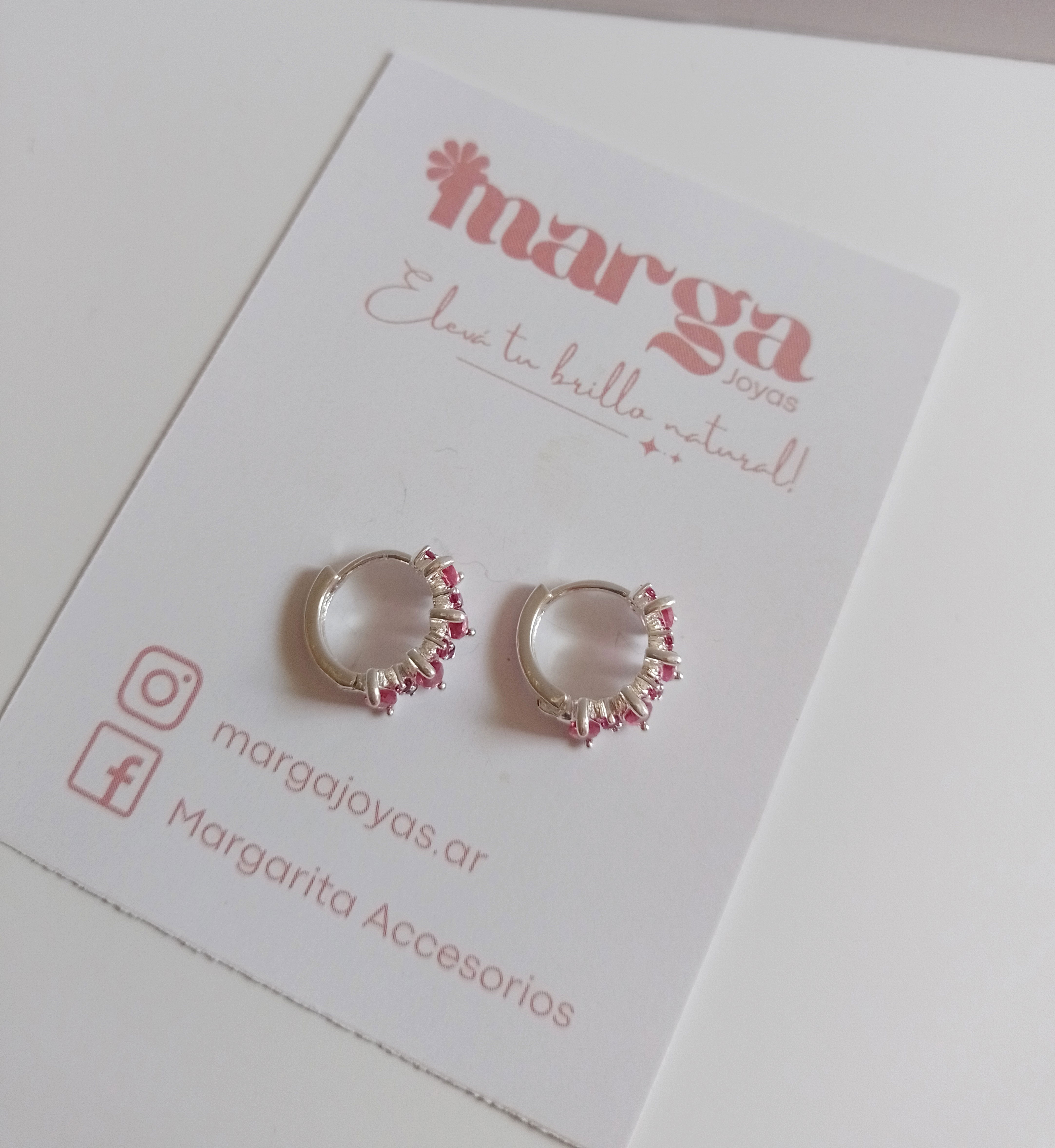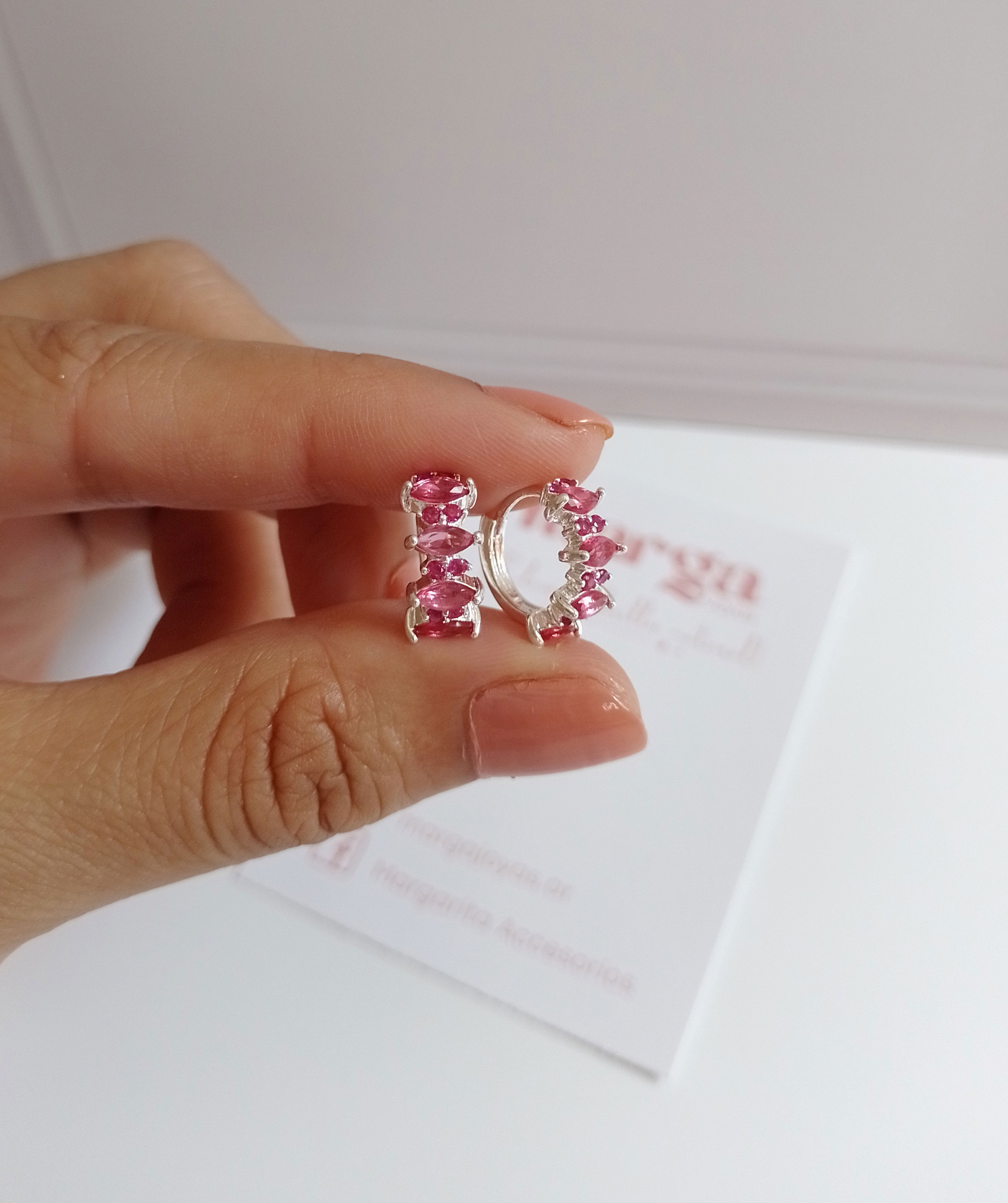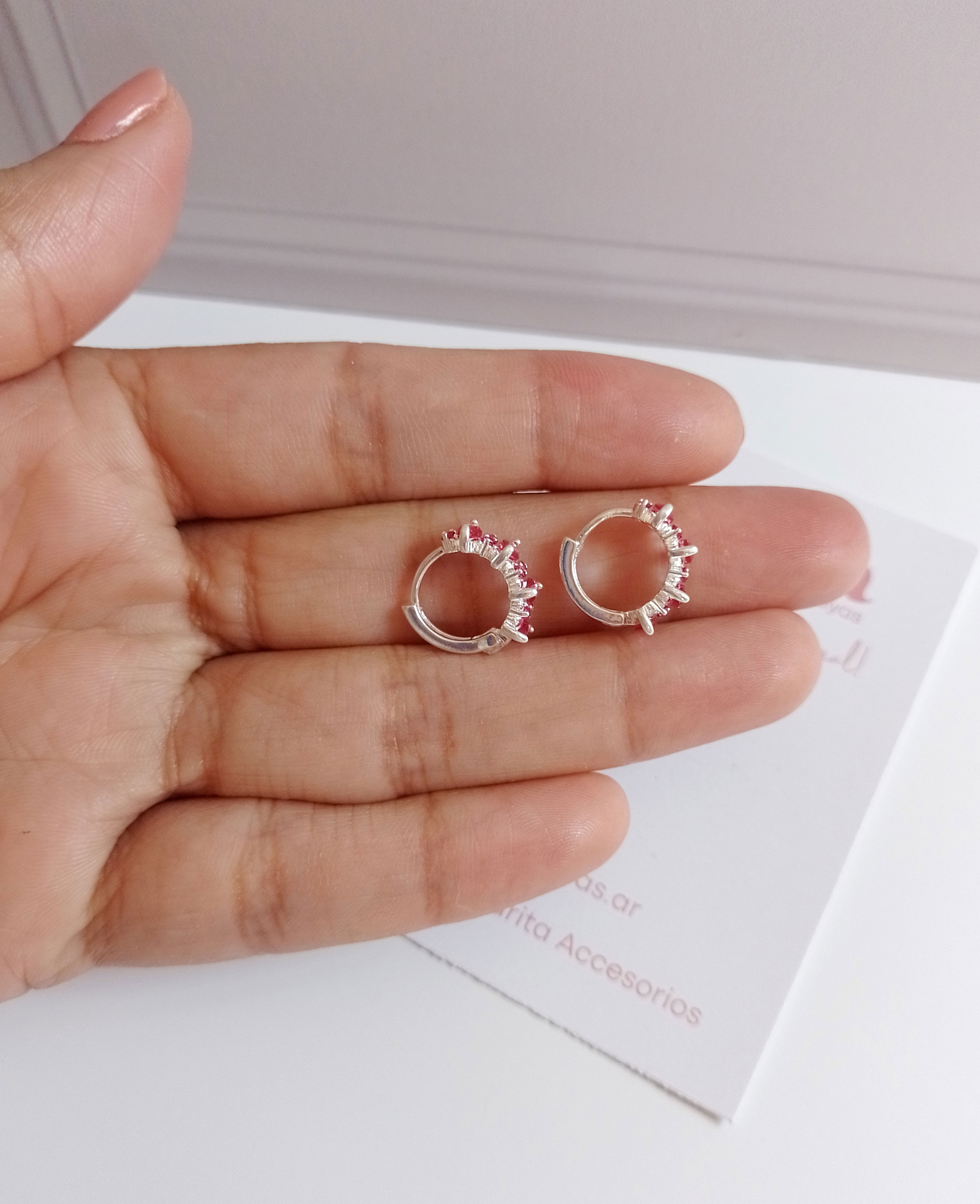 •Argollas de tamaño pequeño laminadas en plata con zirconias color fucsia