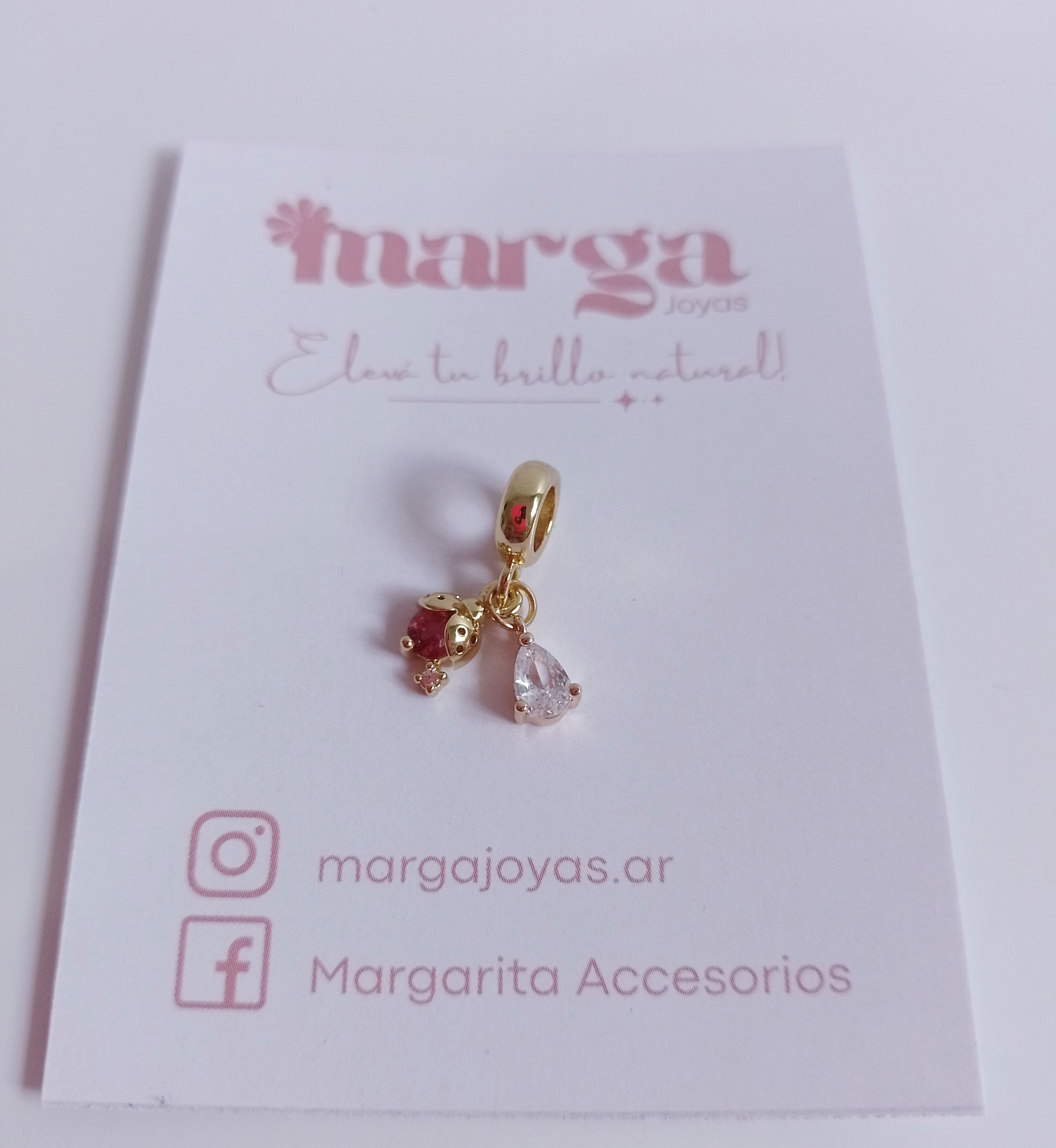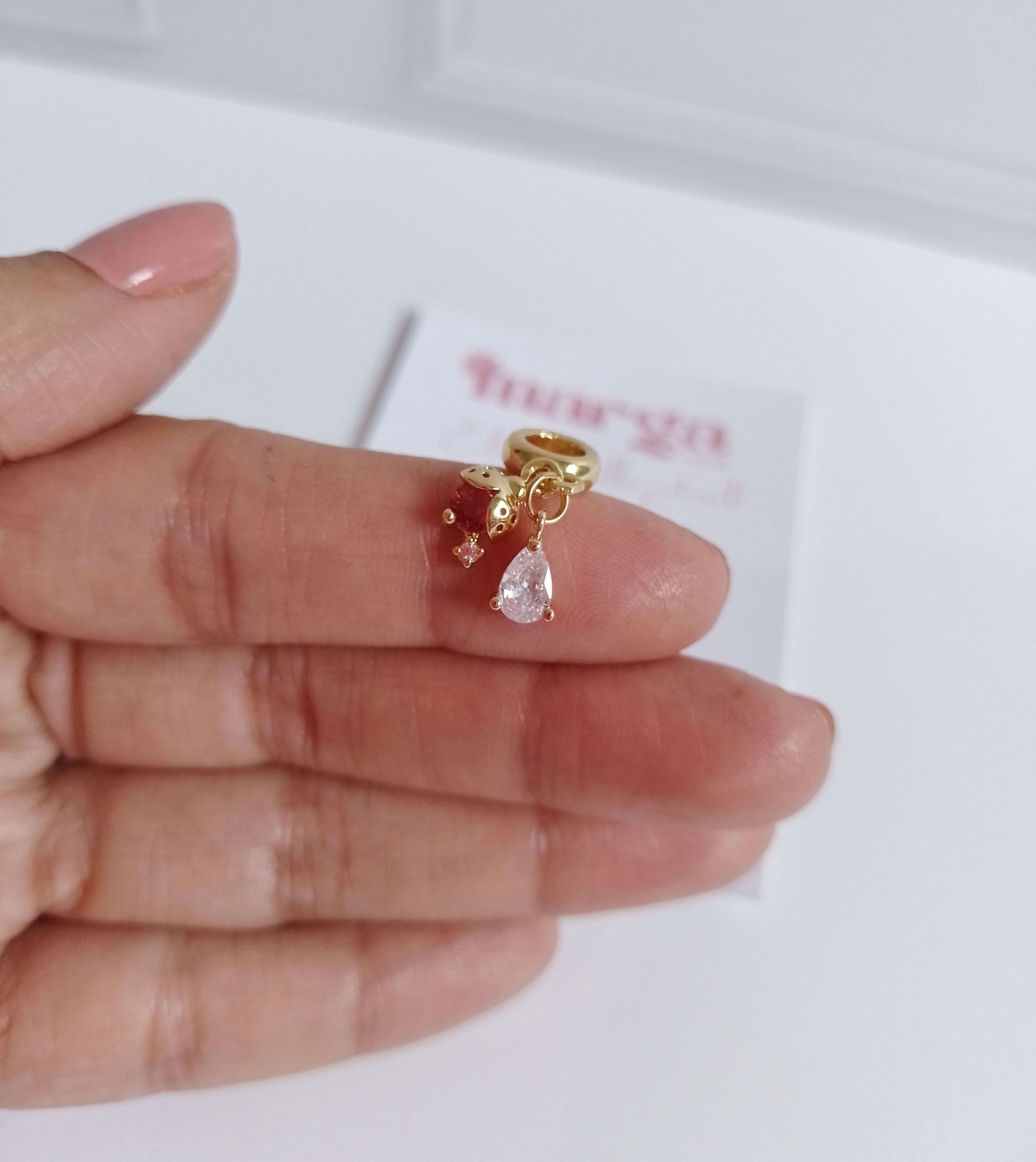 Dije Charm doble para pulseras Pandora con dije cubic gotita cristal y vaquita de san antonio.