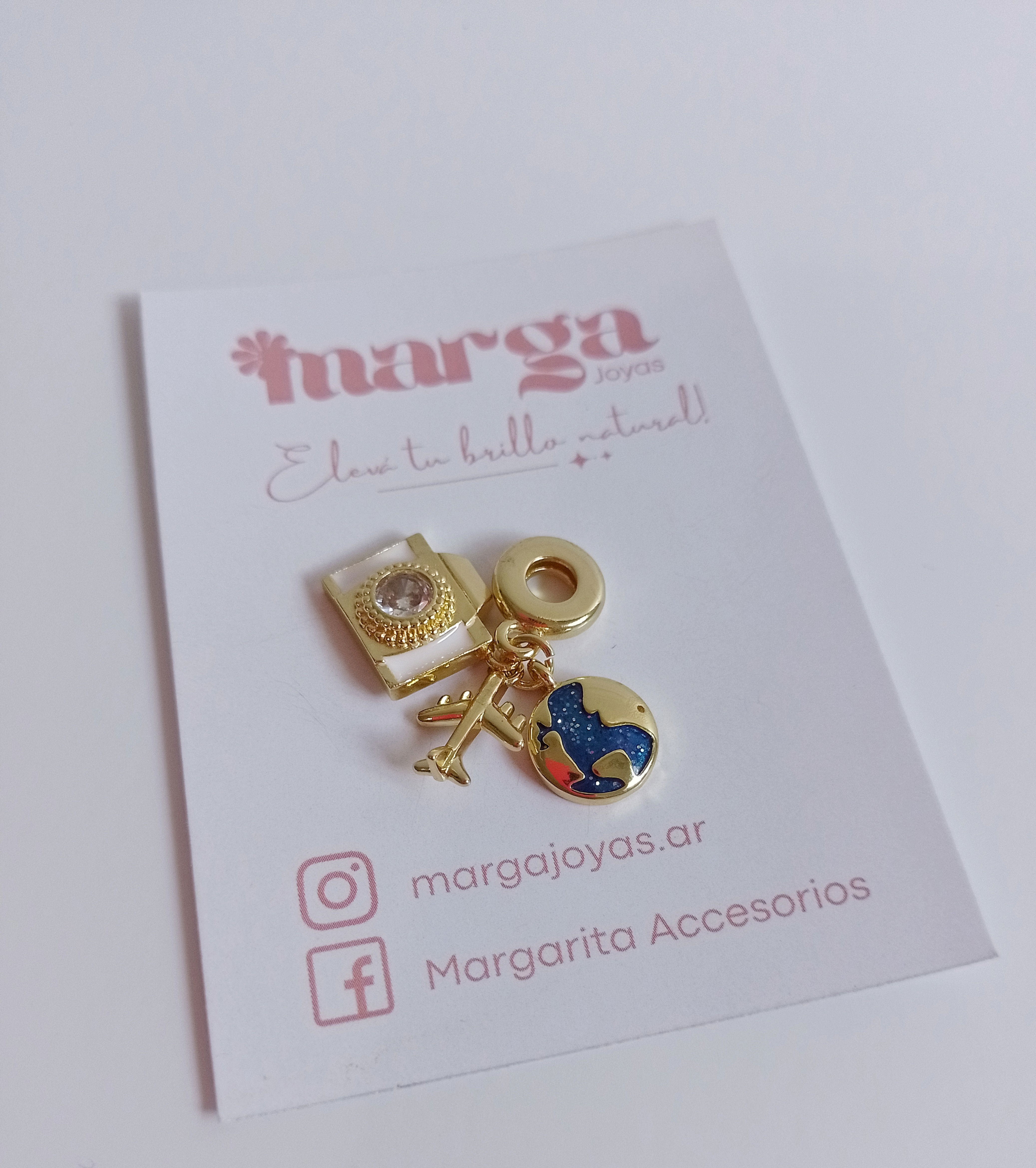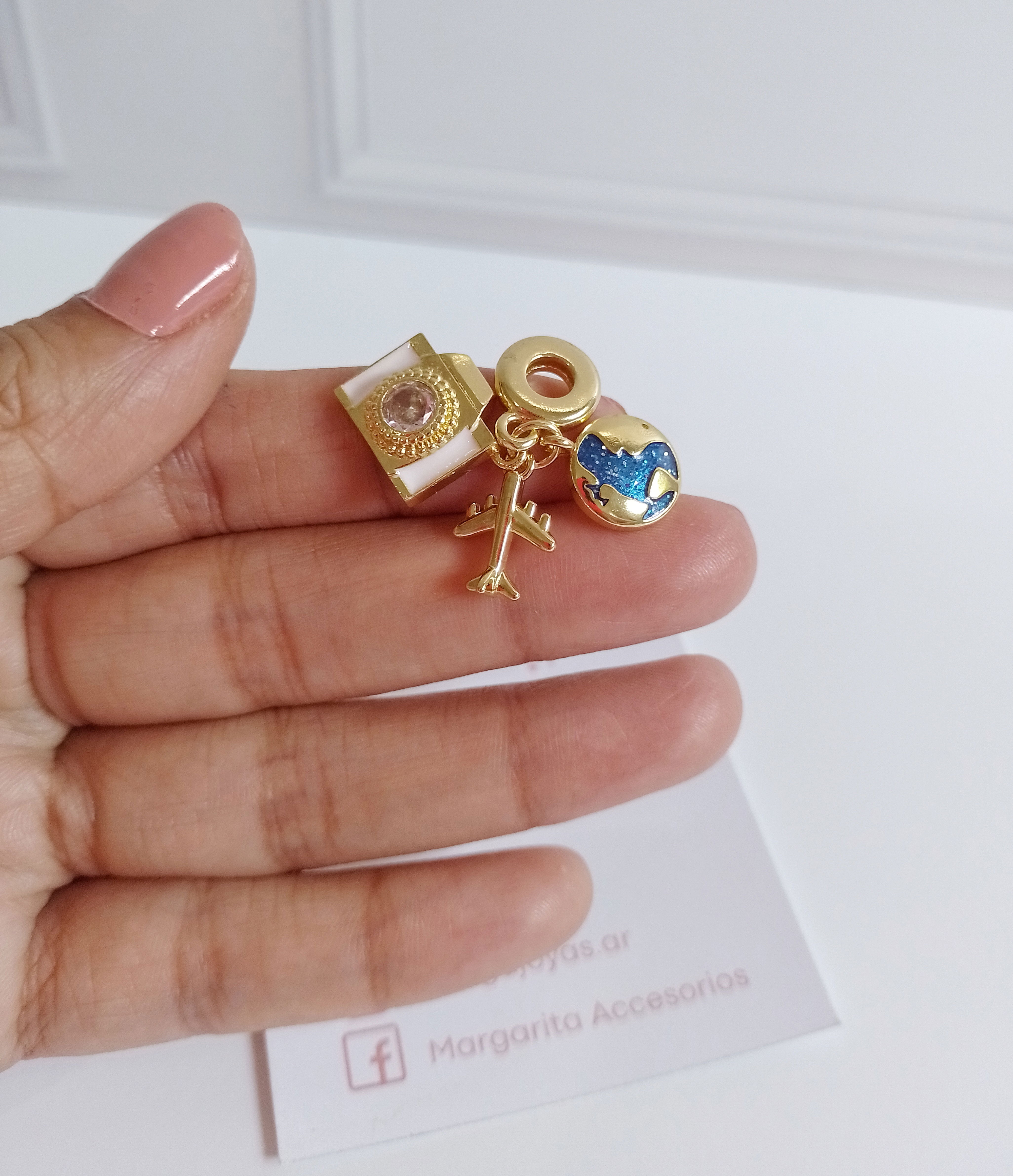 •Dije Charm Triple para Pulseras Pandora con dijes de mundo, camara de fotos y avión.