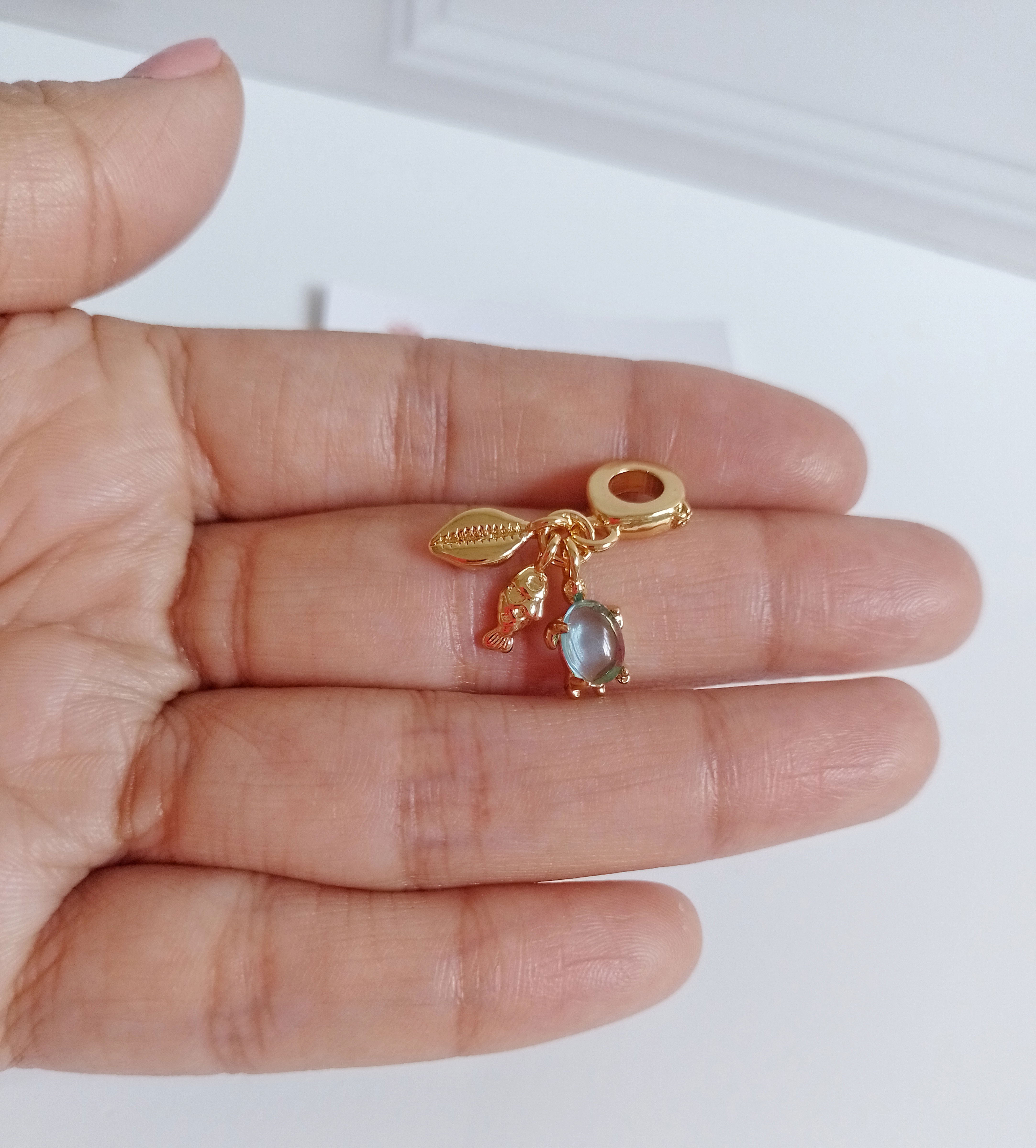 •Dije Charm Triple para Pulseras Pandora, con dijes de caracol, pez y tortuguita.