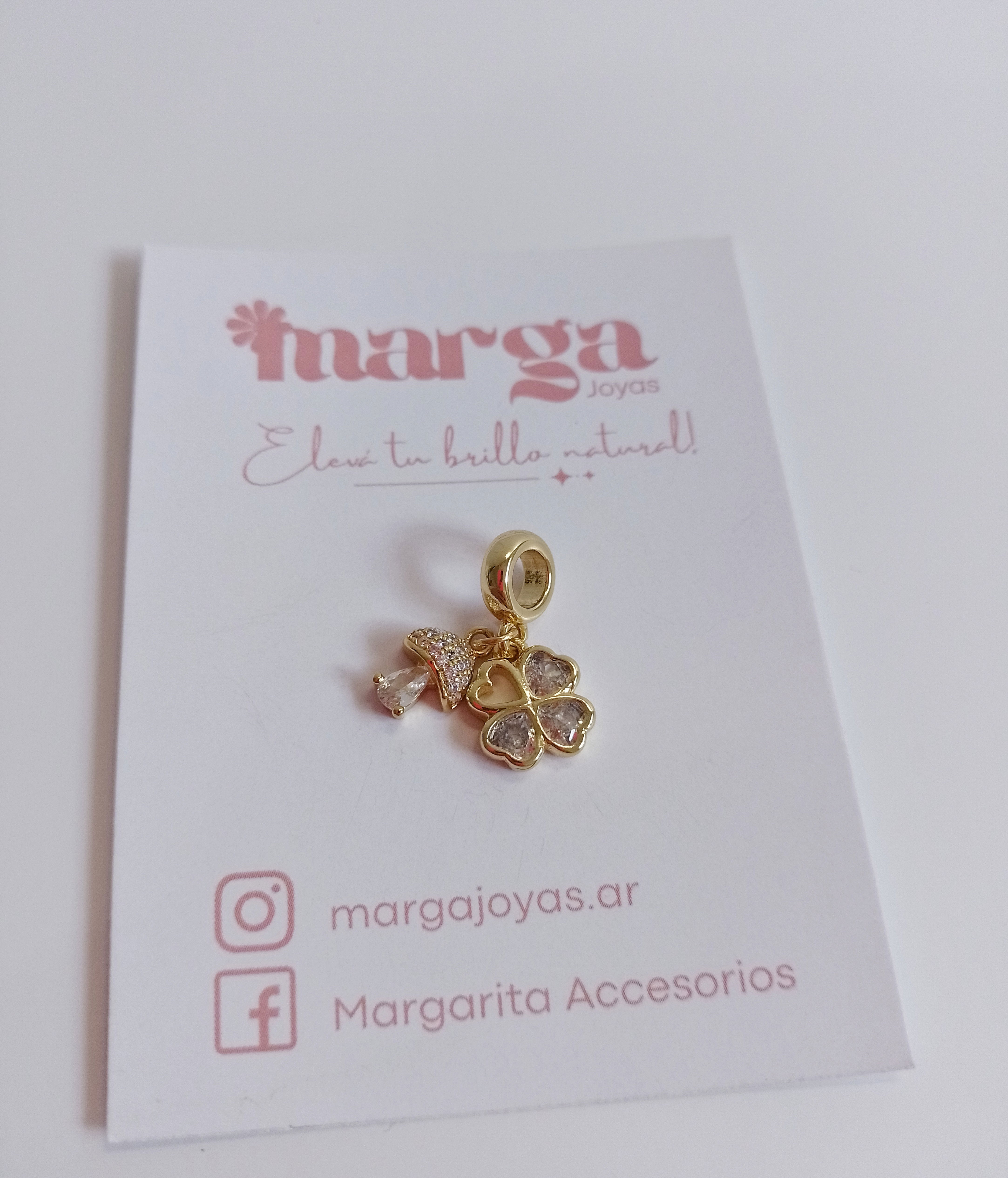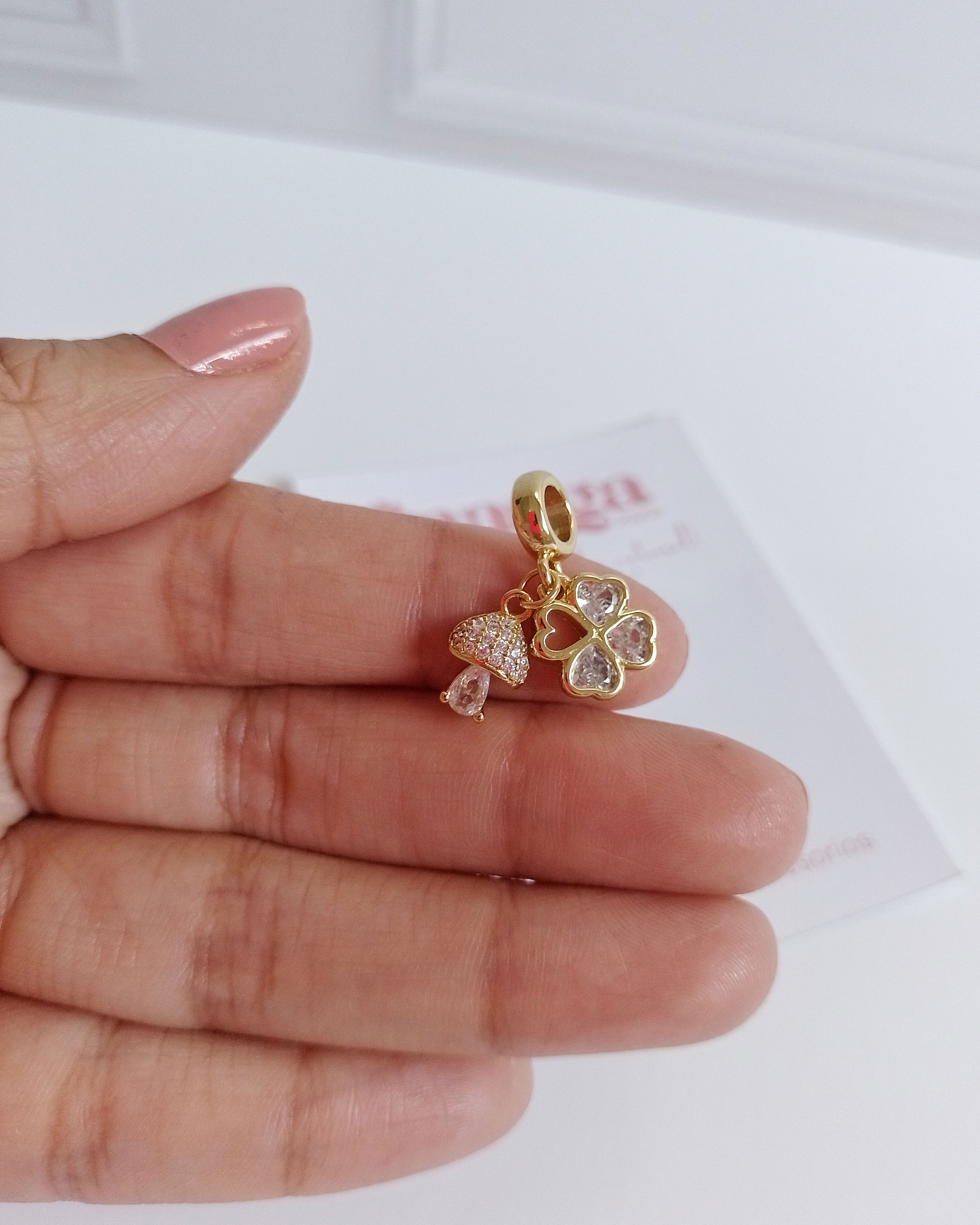 •Dije Charm doble para pulseras Pandora con dije de trebol y honguito seta