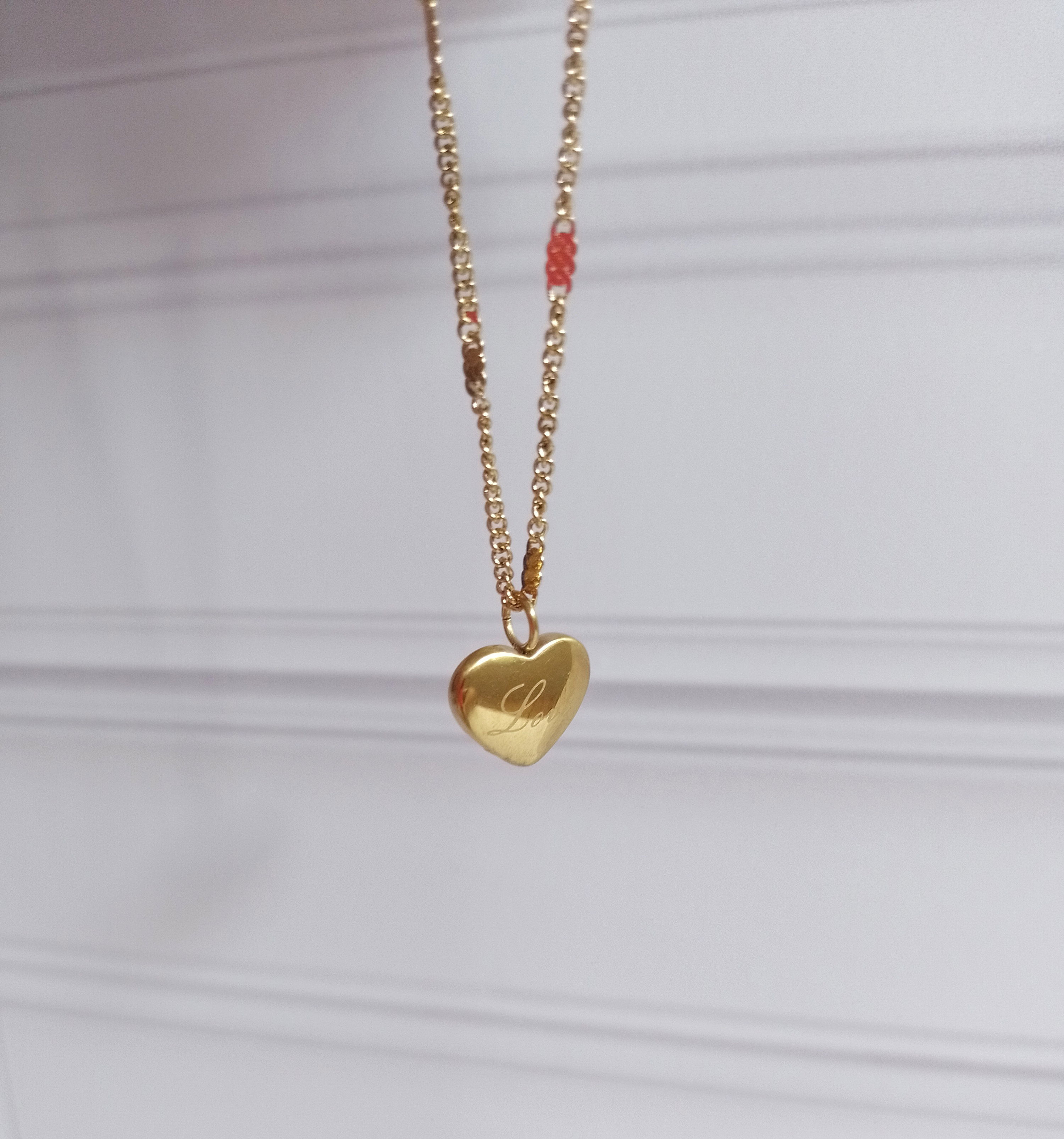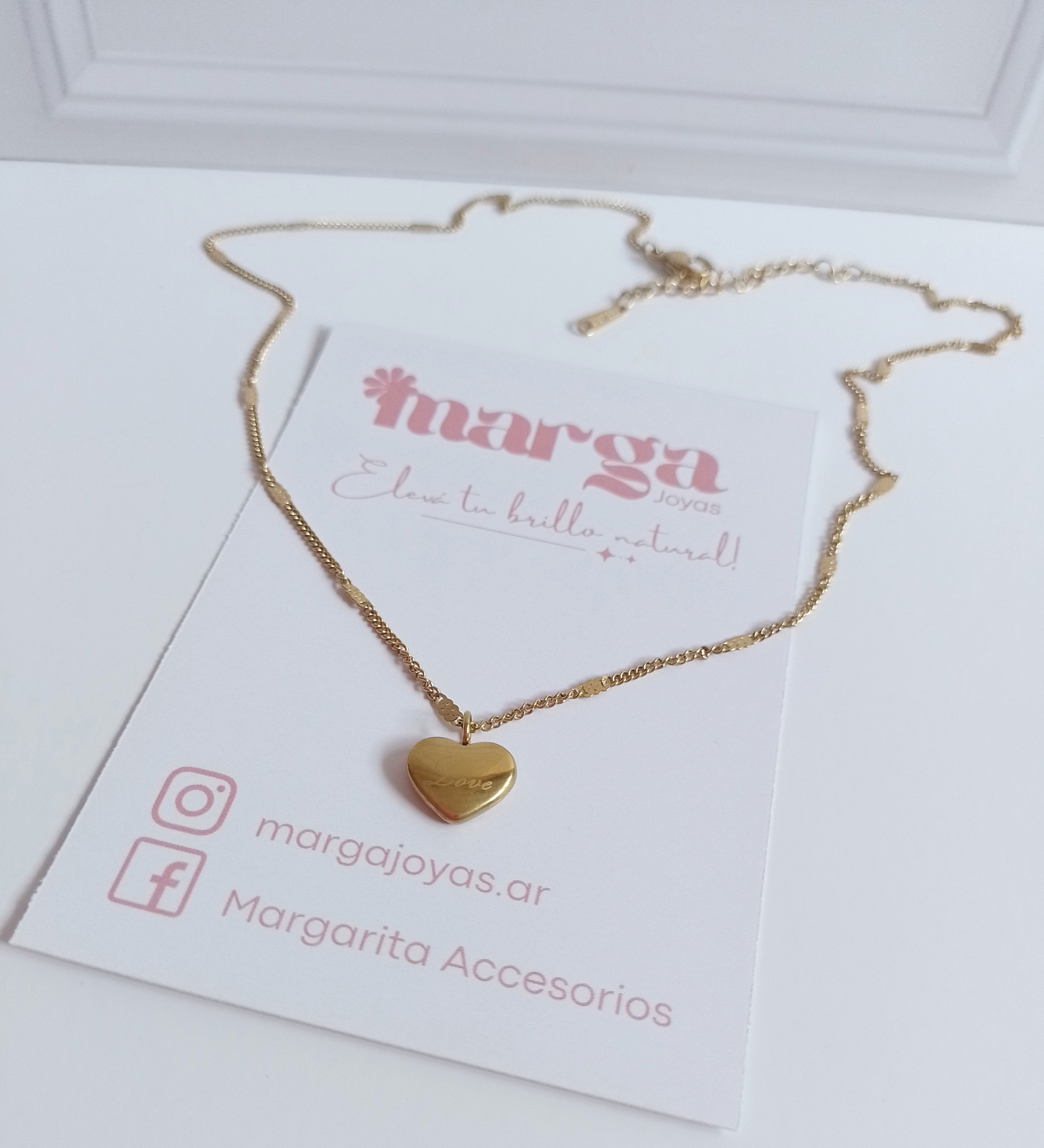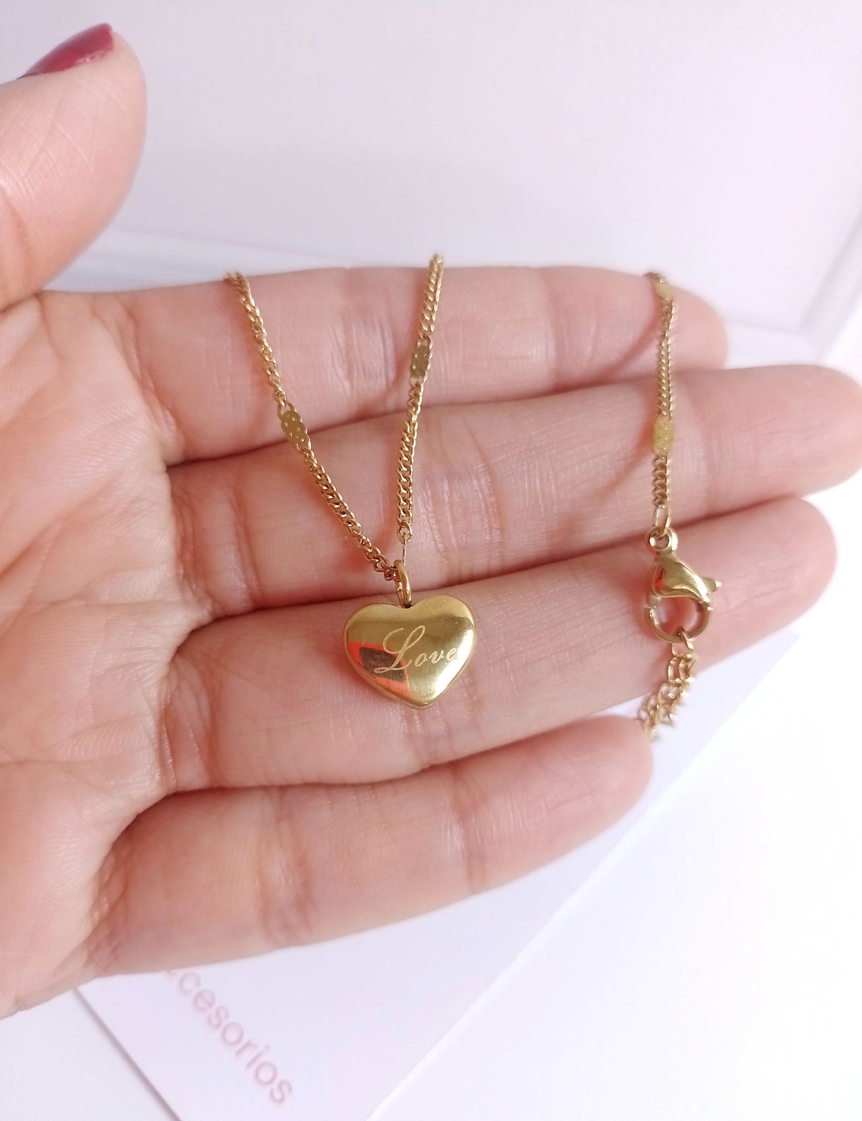 •Collar con dije de corazon inflado y con la leyenda "Love" grabada. Medidas del dije: 1cm de ancho y 0,8 cm de largo.
