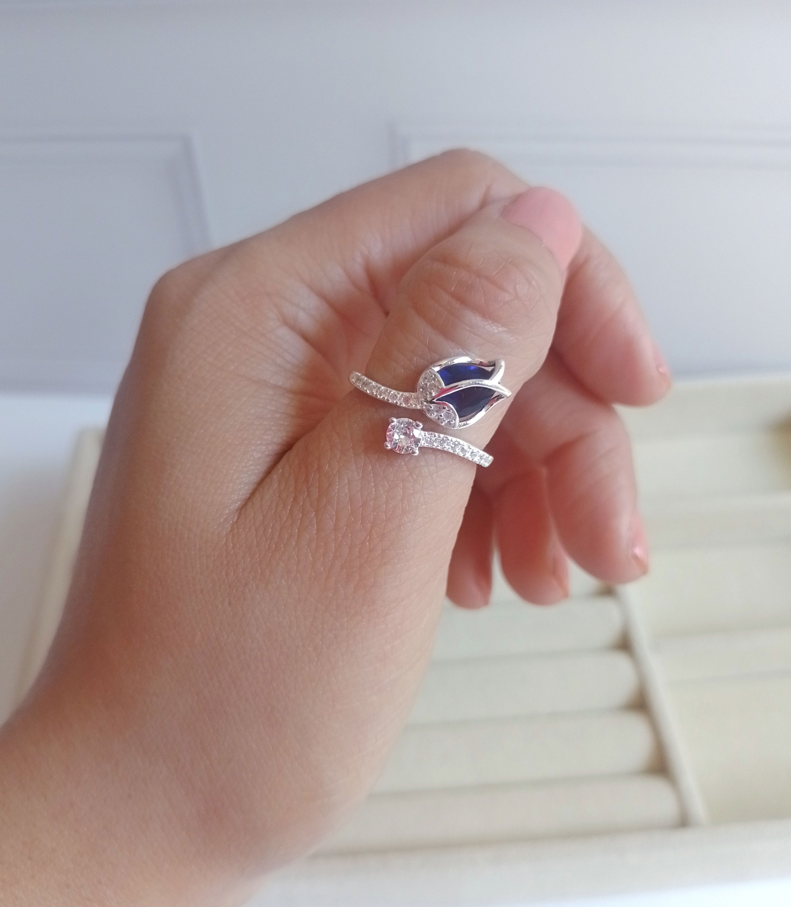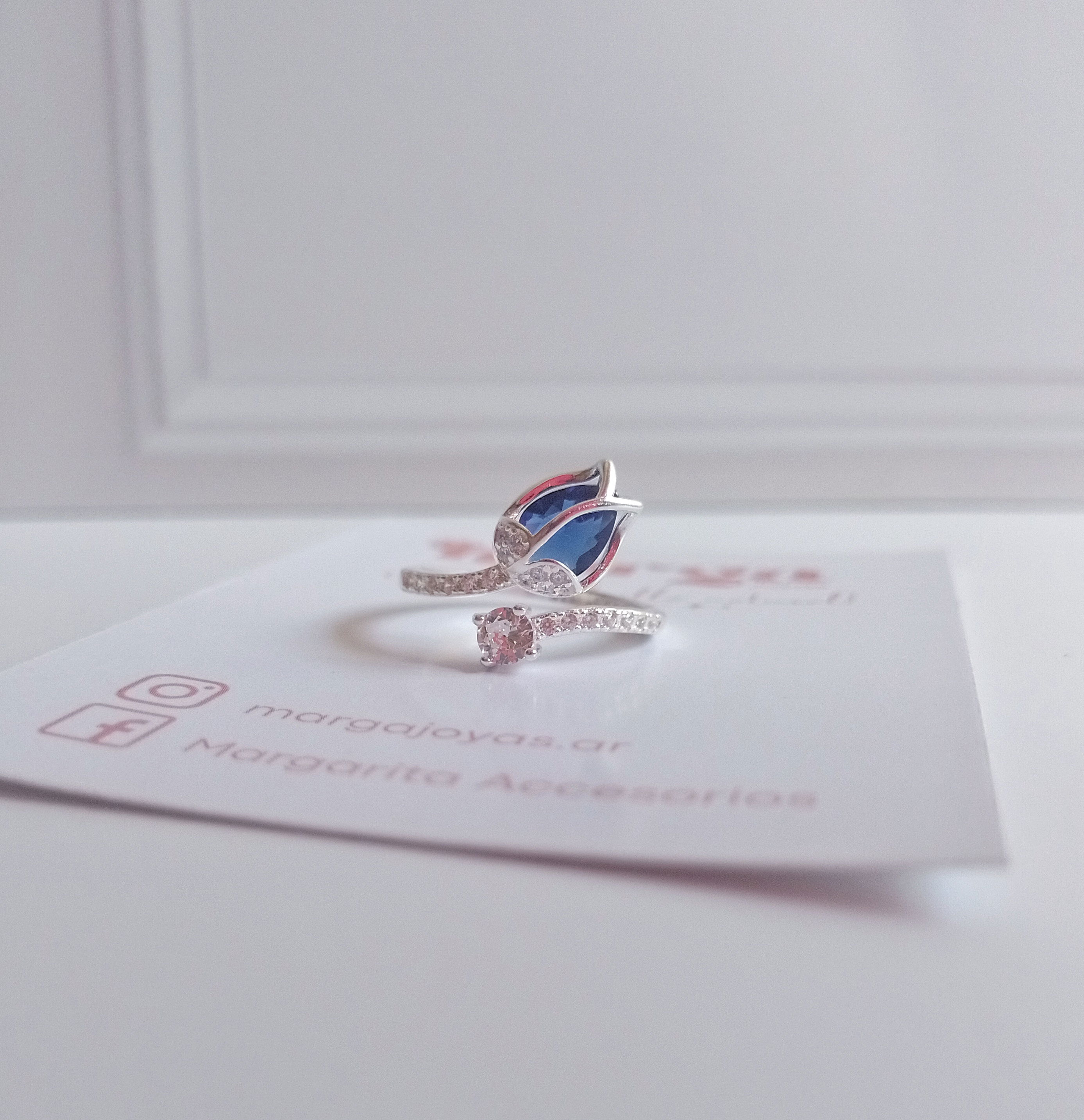 •Anillo de Plata 925 con Zirconia central en color azul y microcubics color cristal