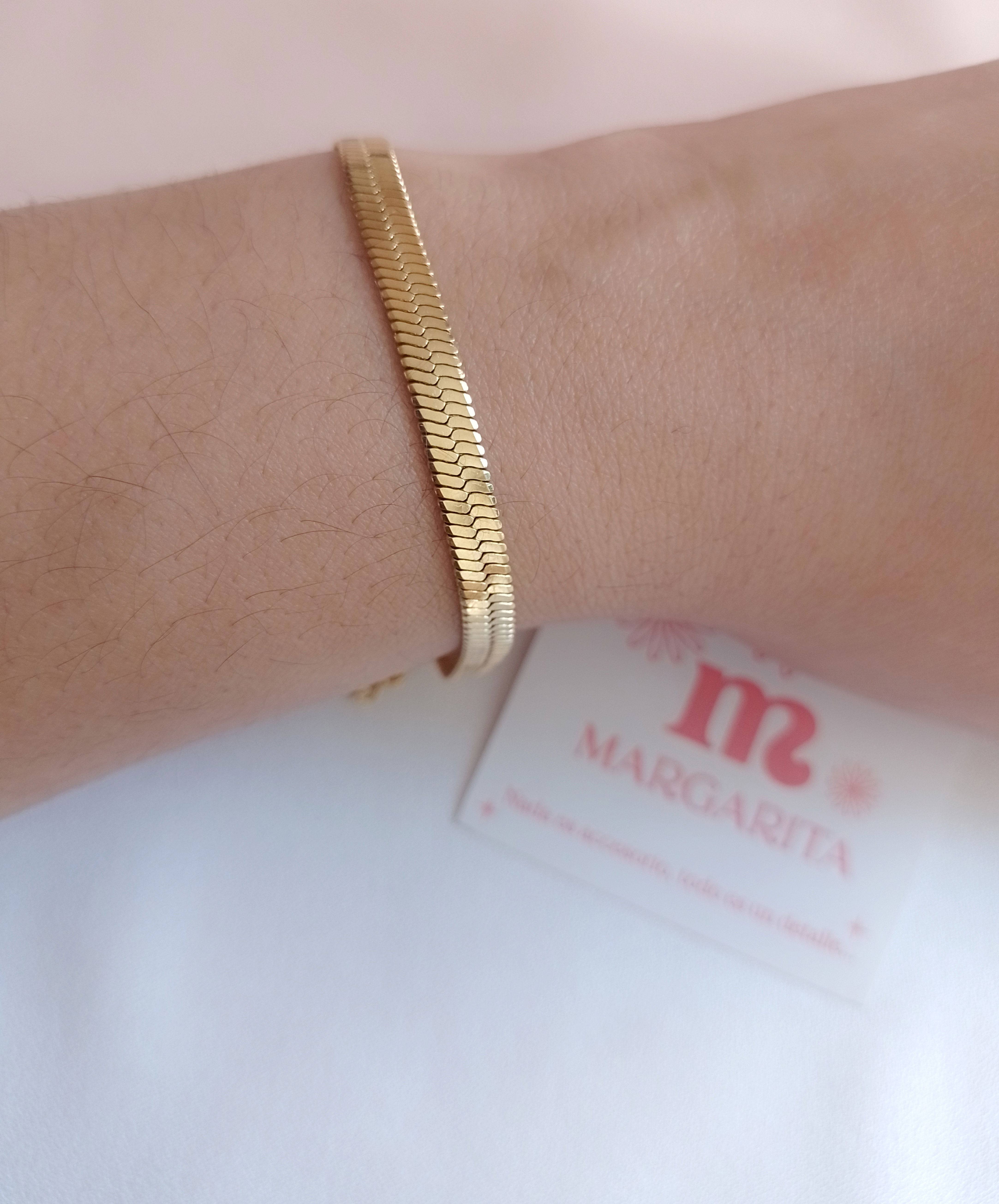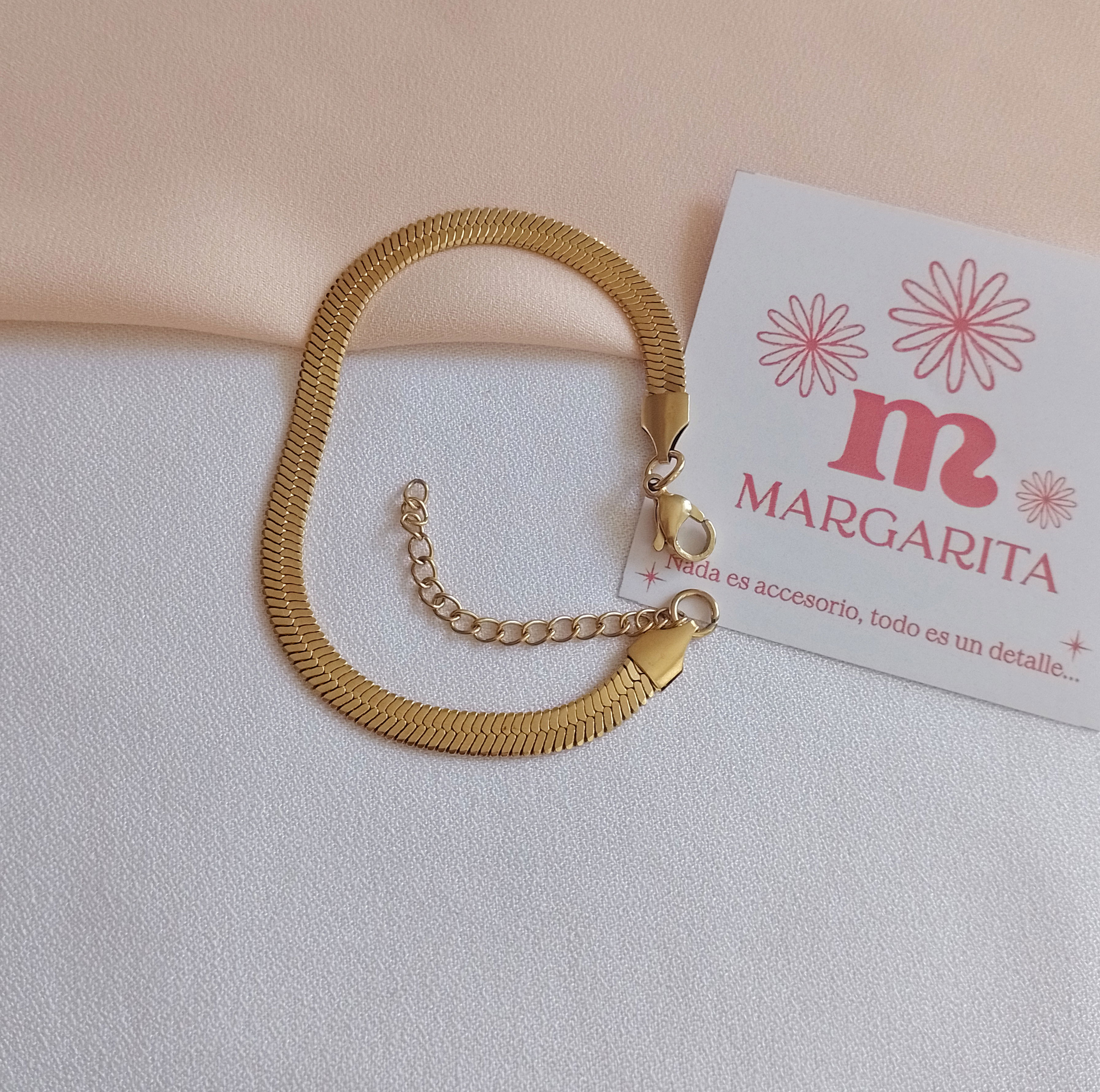•Pulsera Plana de 17,5 cm de largo y 0,5 cm de ancho, con cadenita extensora de 4 cm.