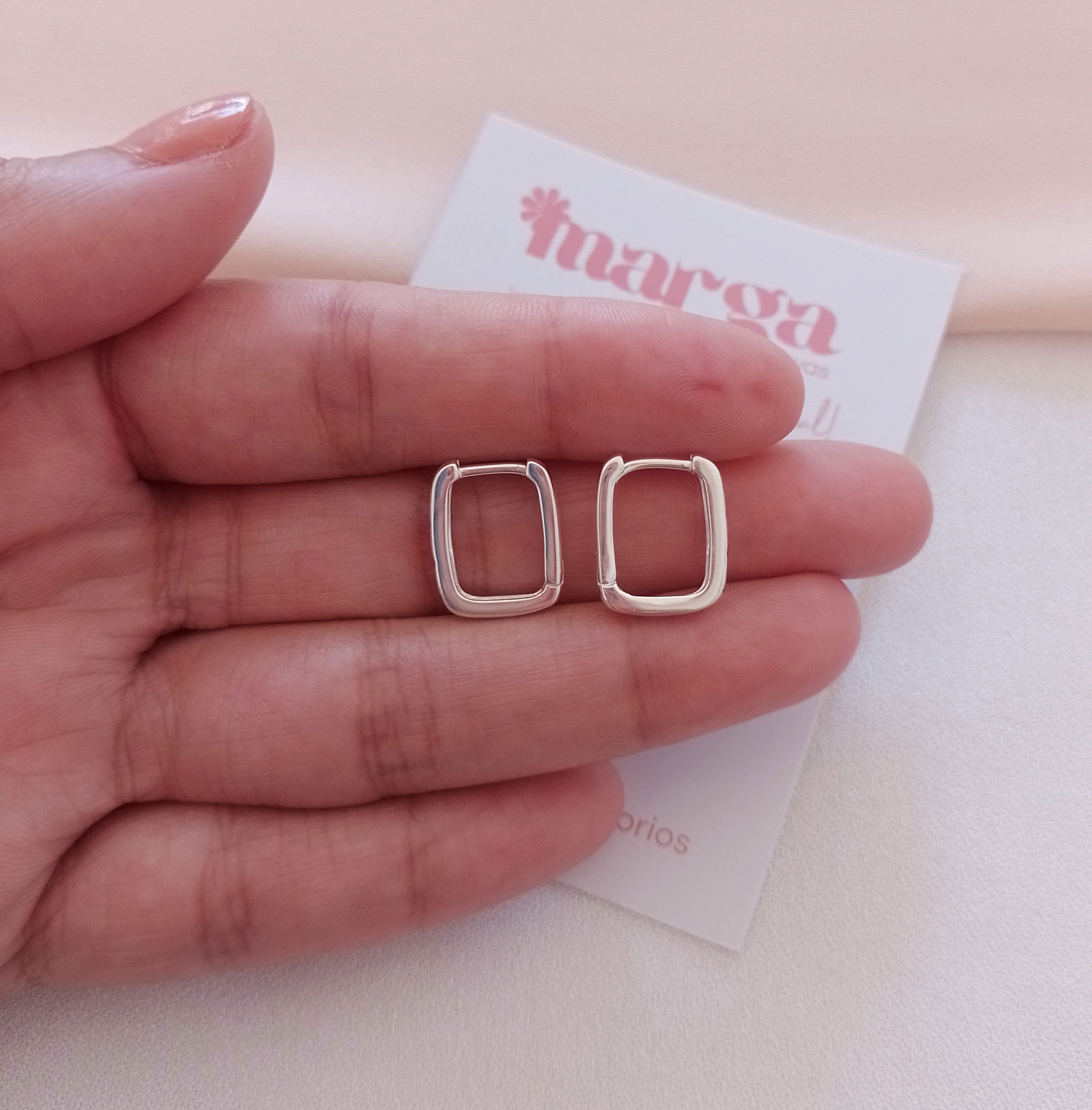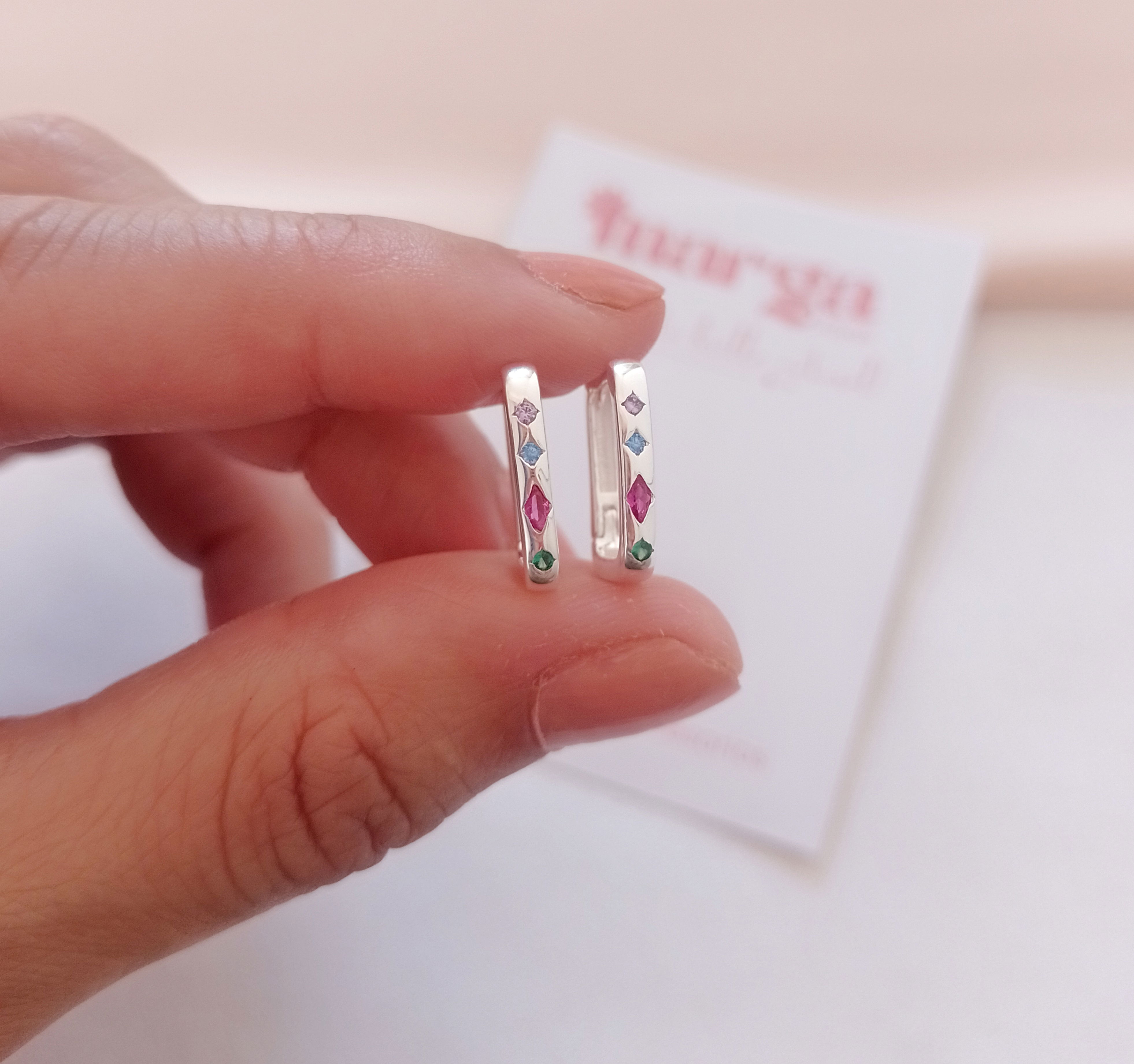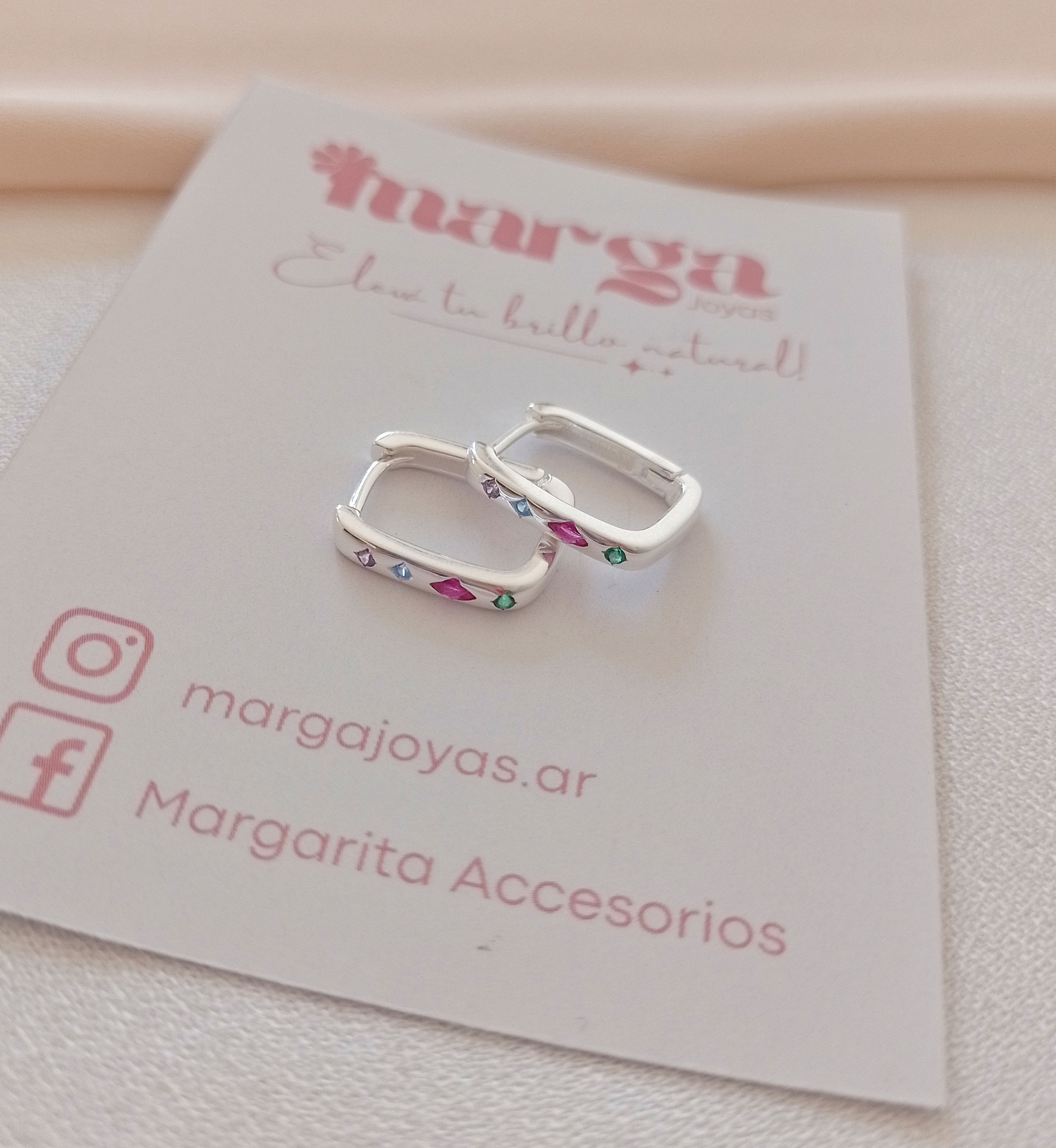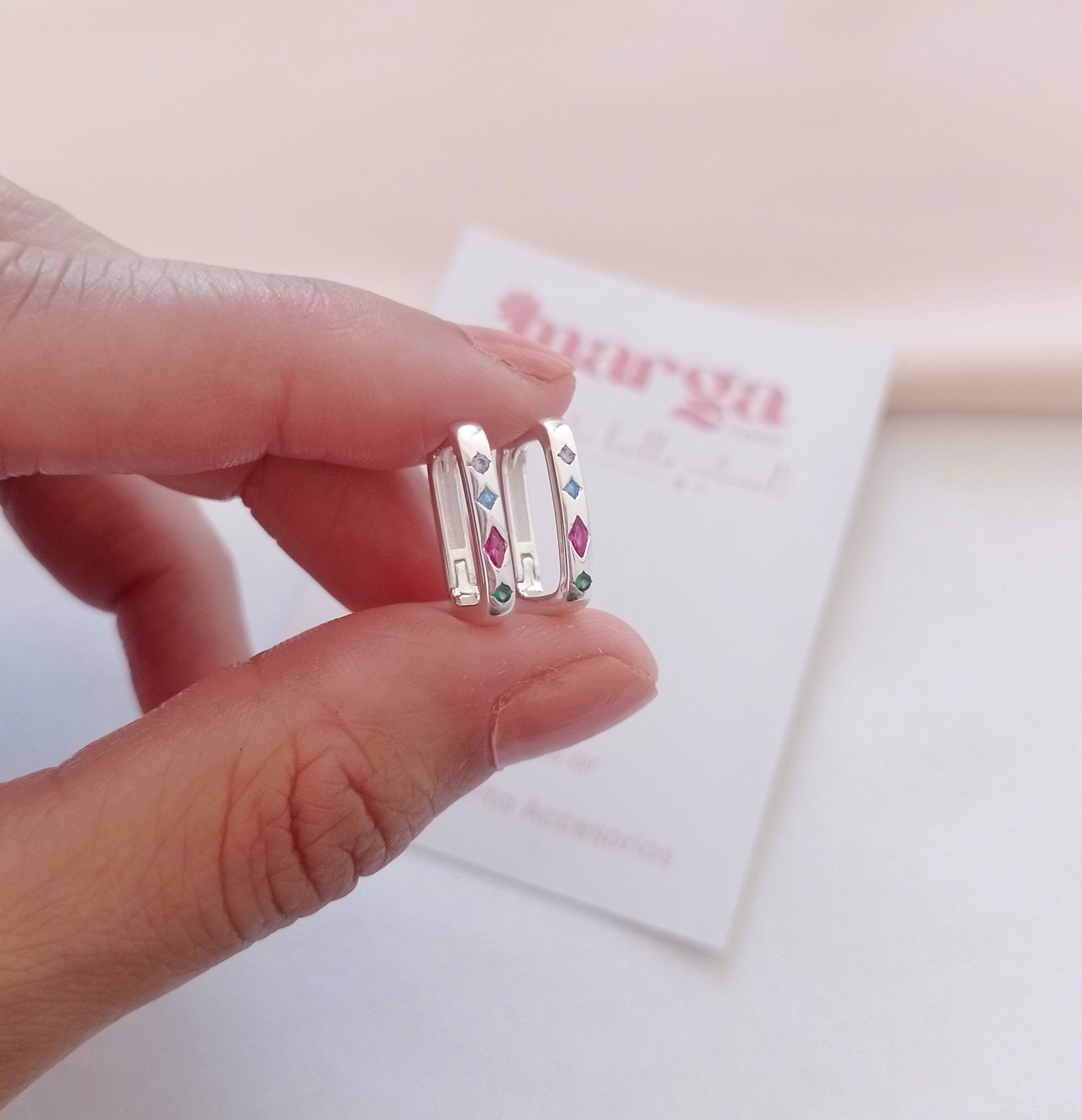 •Argollas rectangulares de Plata 925 con Zirconias en el frente de color Lila, Celeste, Fucsia y Verde.