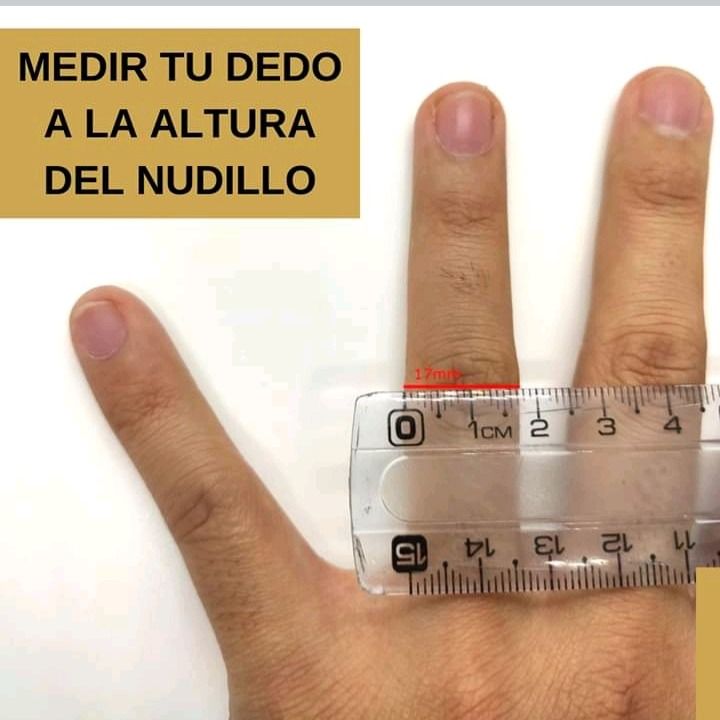 En el ejemplo de esta imagen, la medida del nudillo le da 17 mm (osea 1,7 cm) por lo tanto, en ese dedo tiene un talle 17. Recorda que no en todos los dedos vas a tener el mismo talle y que incluso, el talle puede variar si es mano derecha o mano izquierda, todos tenemos una mano mas grande que la otra.
