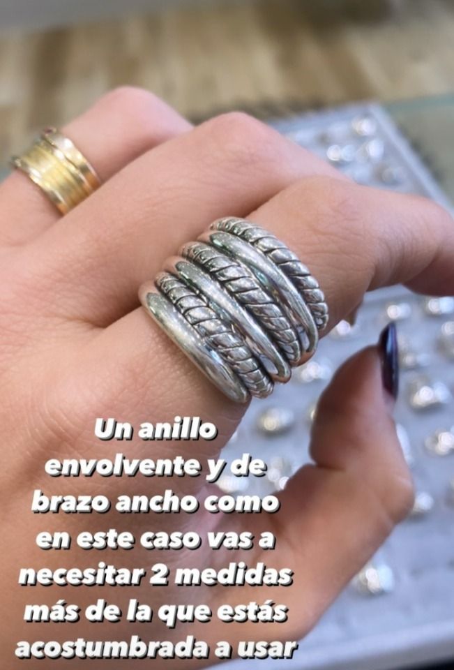 En el caso de anillos grandes, envolventes y anchos, por ejemplo los de plata inflada, acero inflado o plata de electroformatura vas a necesitar dos talles mas del que estas acostumbrada a usar de anillos finos o chicos.