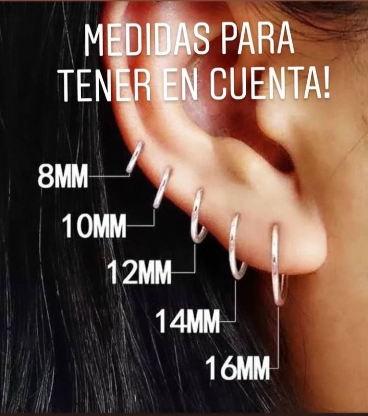 El diámetro de los aros y argollas están detallados debajo de cada producto de la tienda, el diámetro se puede medir con una regla o centímetro. Te dejo estas imágenes para que sepas como hacerlo y una foto ilustrativa que te servira de guia para saber como se ve cada tamaño de argollas puestos en la oreja y asi tengas una referencia.