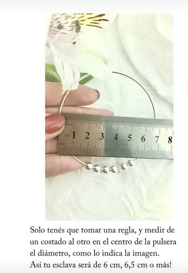 El largo de las Pulseras esta detallado debajo de cada producto y si es un largo regulable o fijo, la forma de medirlas es la misma que con un collar (arriba esta explicado como hacerlo). El diámetro de las Esclavas varia entre 6 y 7 cm por lo general, también esta detallado debajo de cada producto. Acá te dejo una imagen de como tenes que medir con una regla el diámetro de las esclavas si es que ya tenes una: