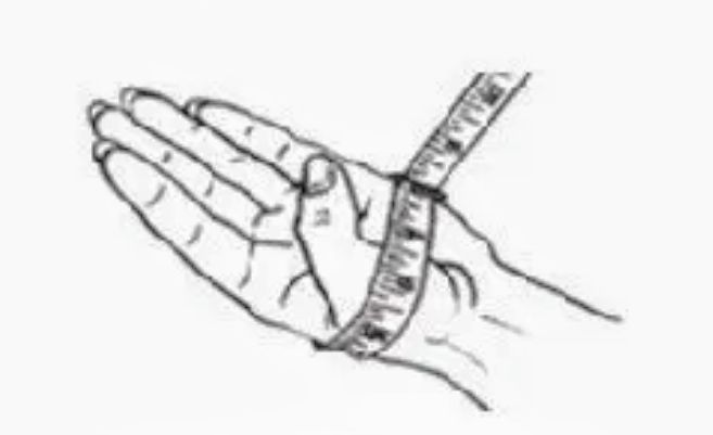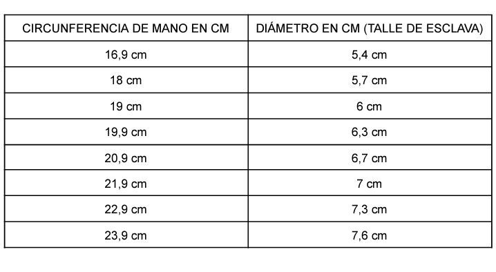 la medicion se hace sobre la mano como se ve en el dibujo con un centimetro de costura y se compara con la tabla de equivalencias para saber que talle (diametro) de esclava tenes